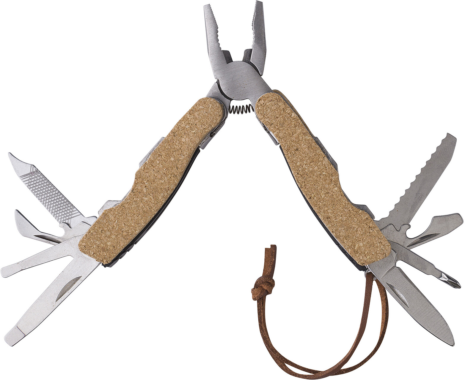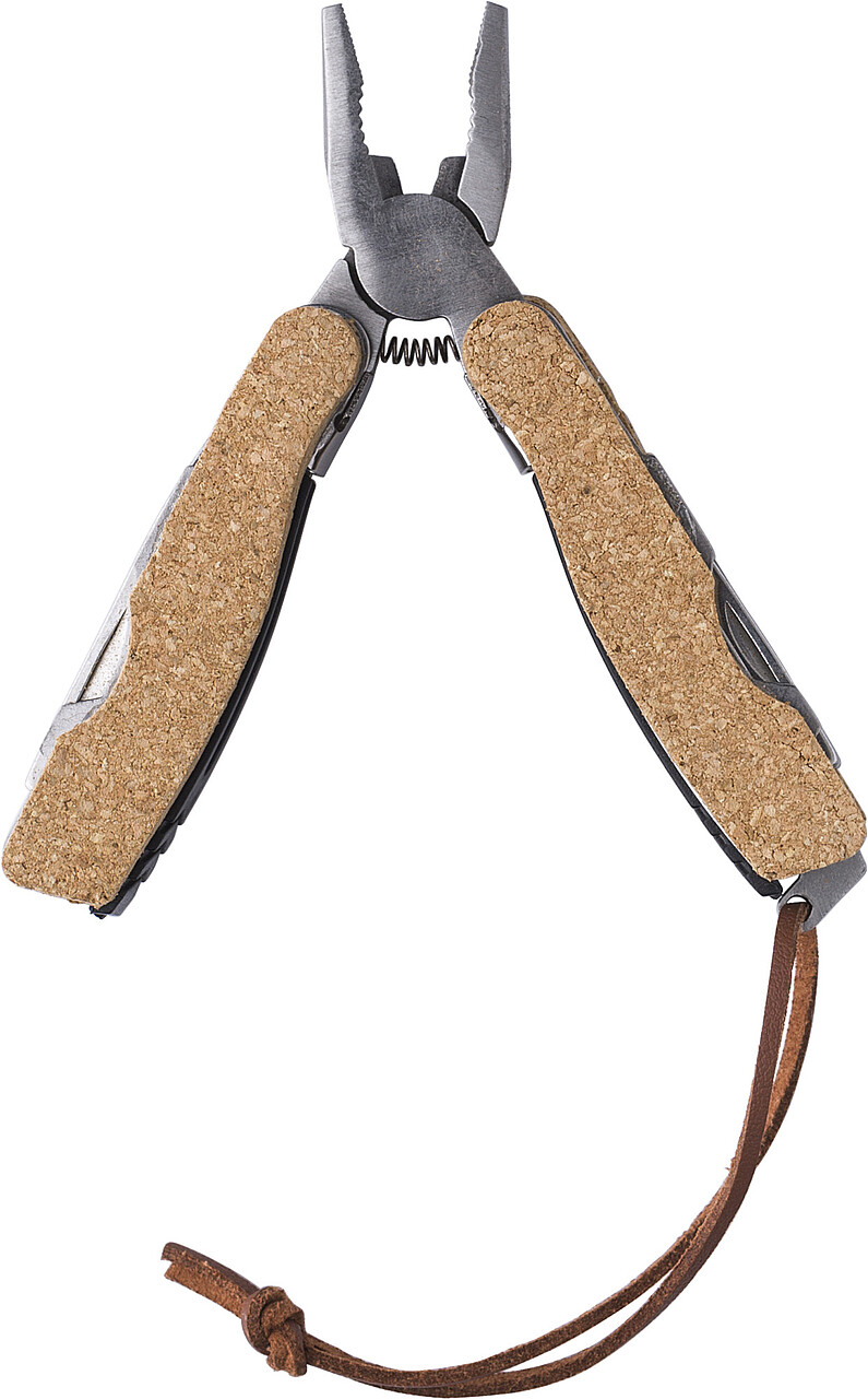 Multitool s 9 nástroji. Rukojeť je pokrytá korkem. Má poutko na zápěstí. Jednotlivě baleno v hnědé kartonové krabici. Rozměry: 9.5 x 9 x 2.2 cm
