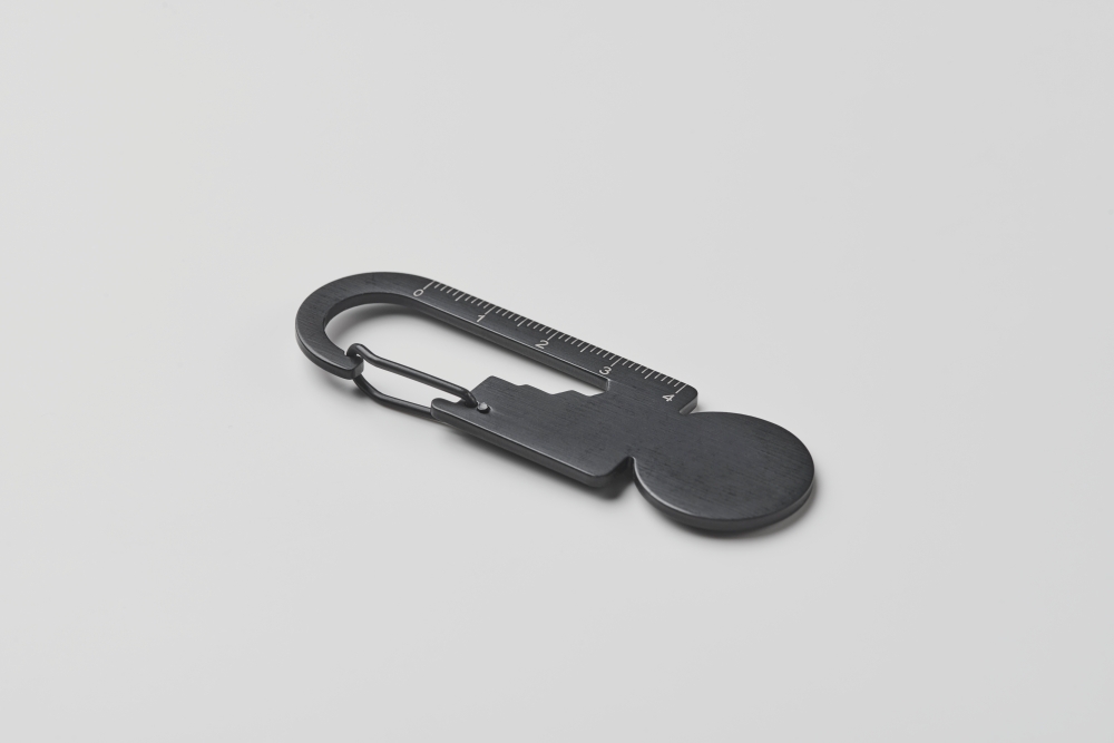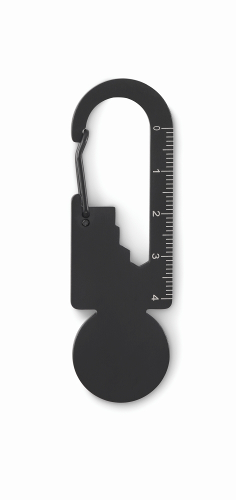 Multifunkční přívěšek na klíče z recyklované nerezové oceli (90 % recyklovaná nerezová ocel a 10 % nerezová ocel) s 6 funkcemi: žeton do vozíku, otvírák na láhve, pravítko a šestihranný klíč 5,5 mm, 7 mm a 8 mm. Rozměry: 7,5 × 2,9 cm,