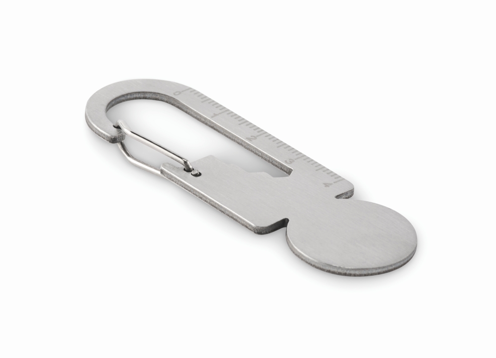 Multifunkční přívěšek na klíče z recyklované nerezové oceli (90 % recyklovaná nerezová ocel a 10 % nerezová ocel) s 6 funkcemi: žeton do vozíku, otvírák na láhve, pravítko a šestihranný klíč 5,5 mm, 7 mm a 8 mm. Rozměry: 7,5 × 2,9 cm,