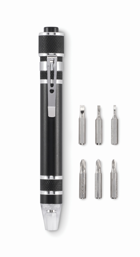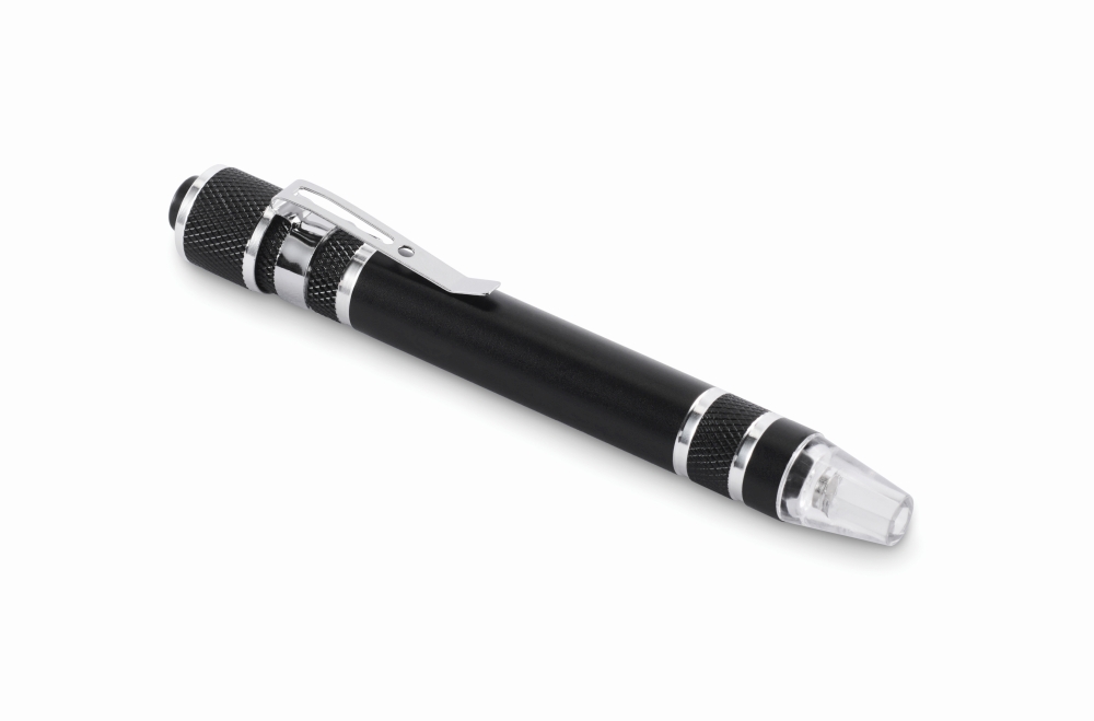 Multifunkční nástroj ve tvaru pera s baterkou, z recyklovaného hliníku. Obsahuje 3 ploché a 3 křížové šroubovací bity. 4 knoflíkové baterie LR41 jsou součástí balení. Rozměry: 12,9 x O1,58 cm