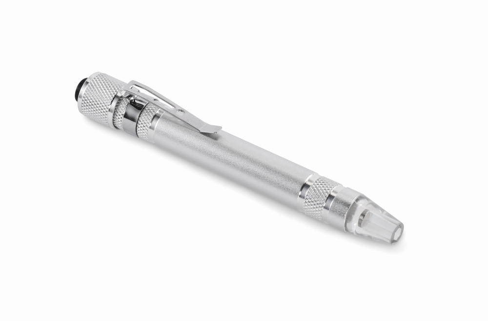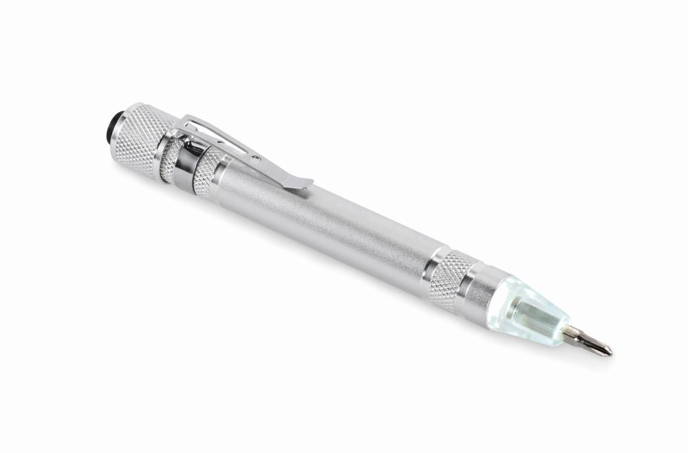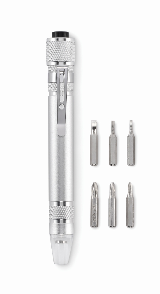 Multifunkční nástroj ve tvaru pera s baterkou, z recyklovaného hliníku. Obsahuje 3 ploché a 3 křížové šroubovací bity. 4 knoflíkové baterie LR41 jsou součástí balení. Rozměry: 12,9 x O1,58 cm
