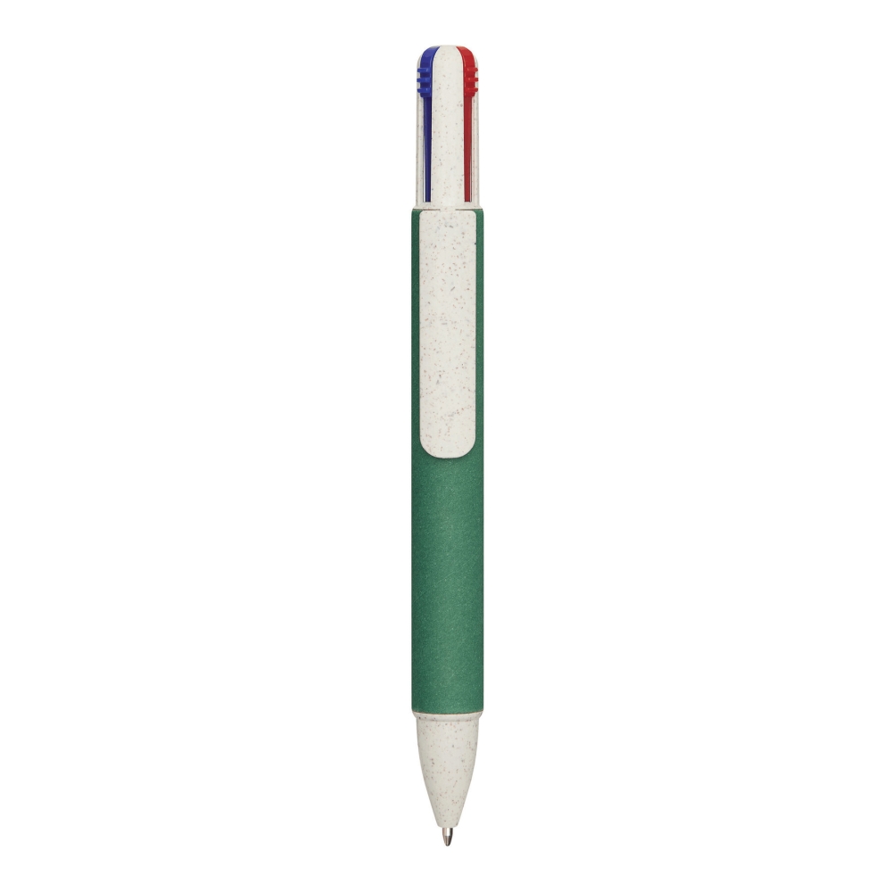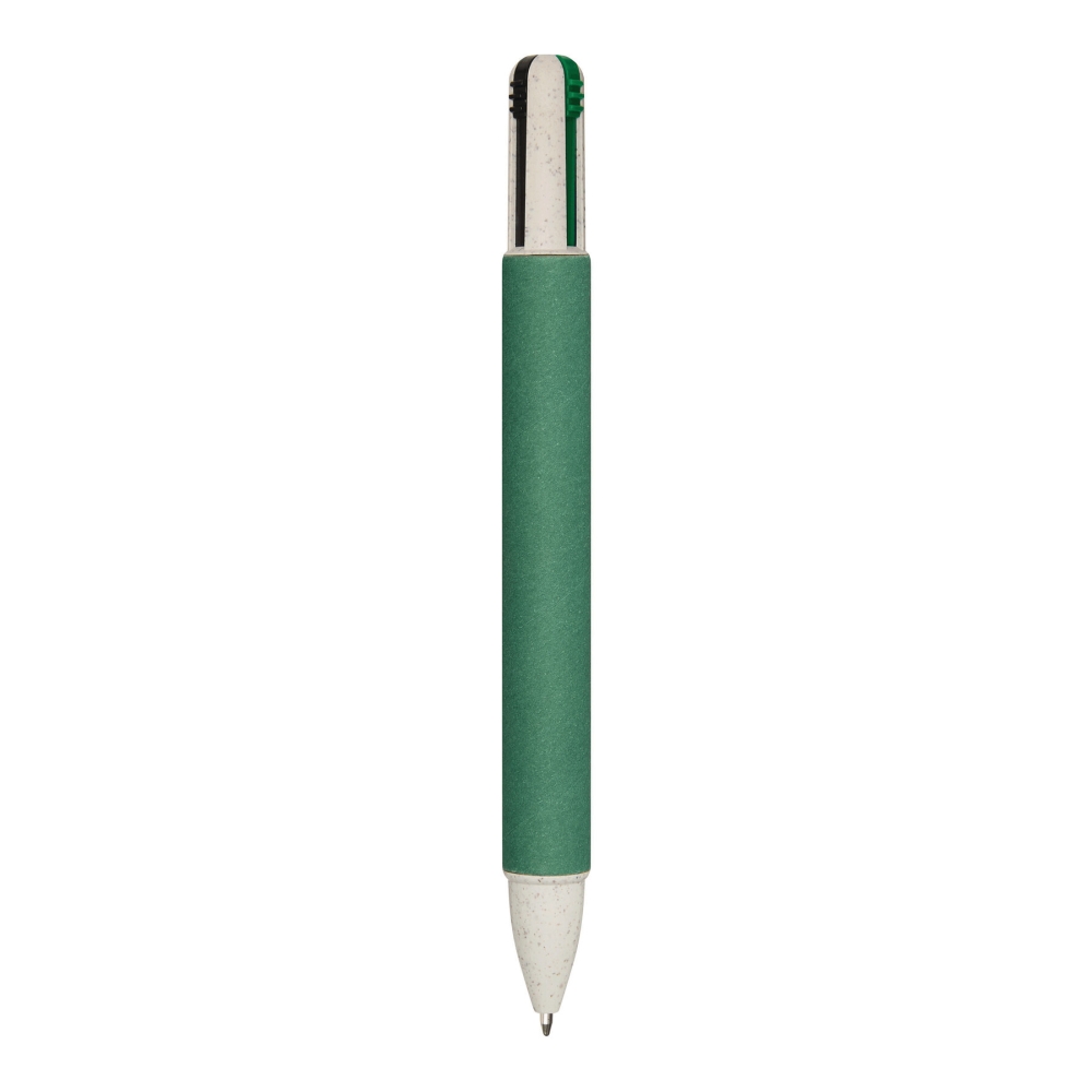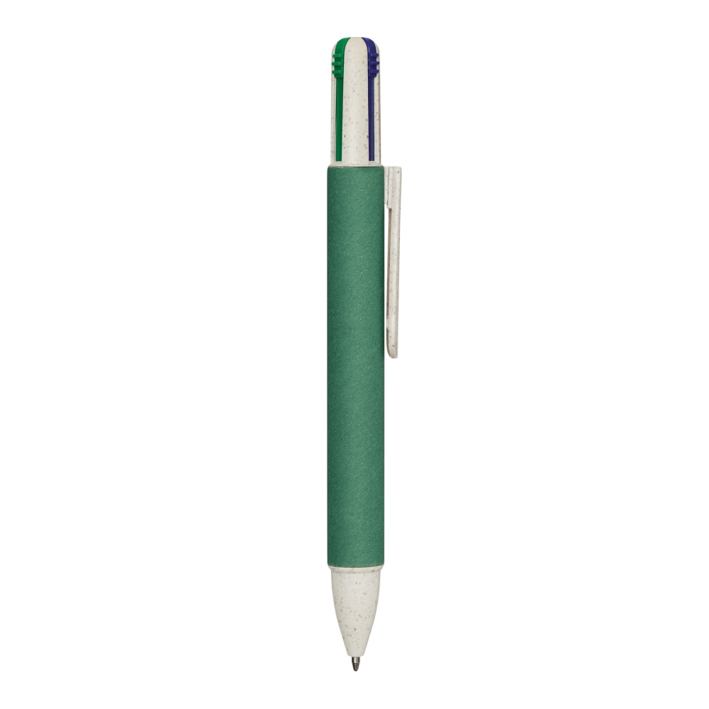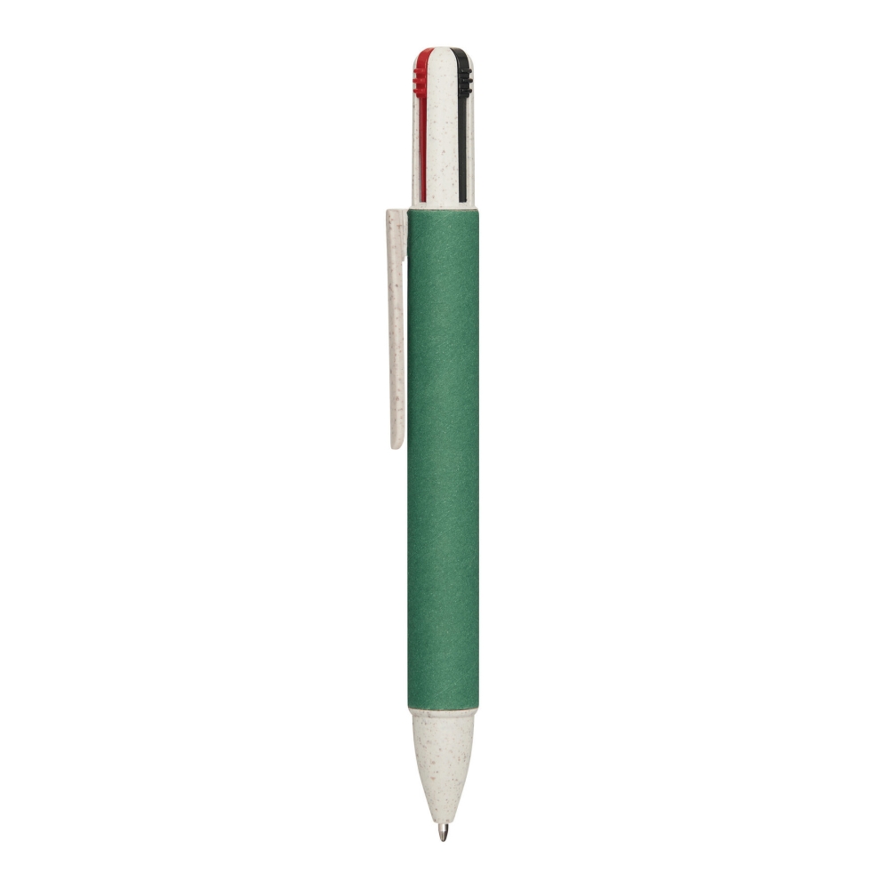 Multifunkční propiska, čtyři barvy. Vyrobeno z pšeničné slámy a ABS plastu, tělo potažené recyklovaným kartonem, tlačítkový mechanismus, náplně do kuličkového pera s černým, červeným, modrým a červeným inkoustem. Rozměry: 14,3 cm