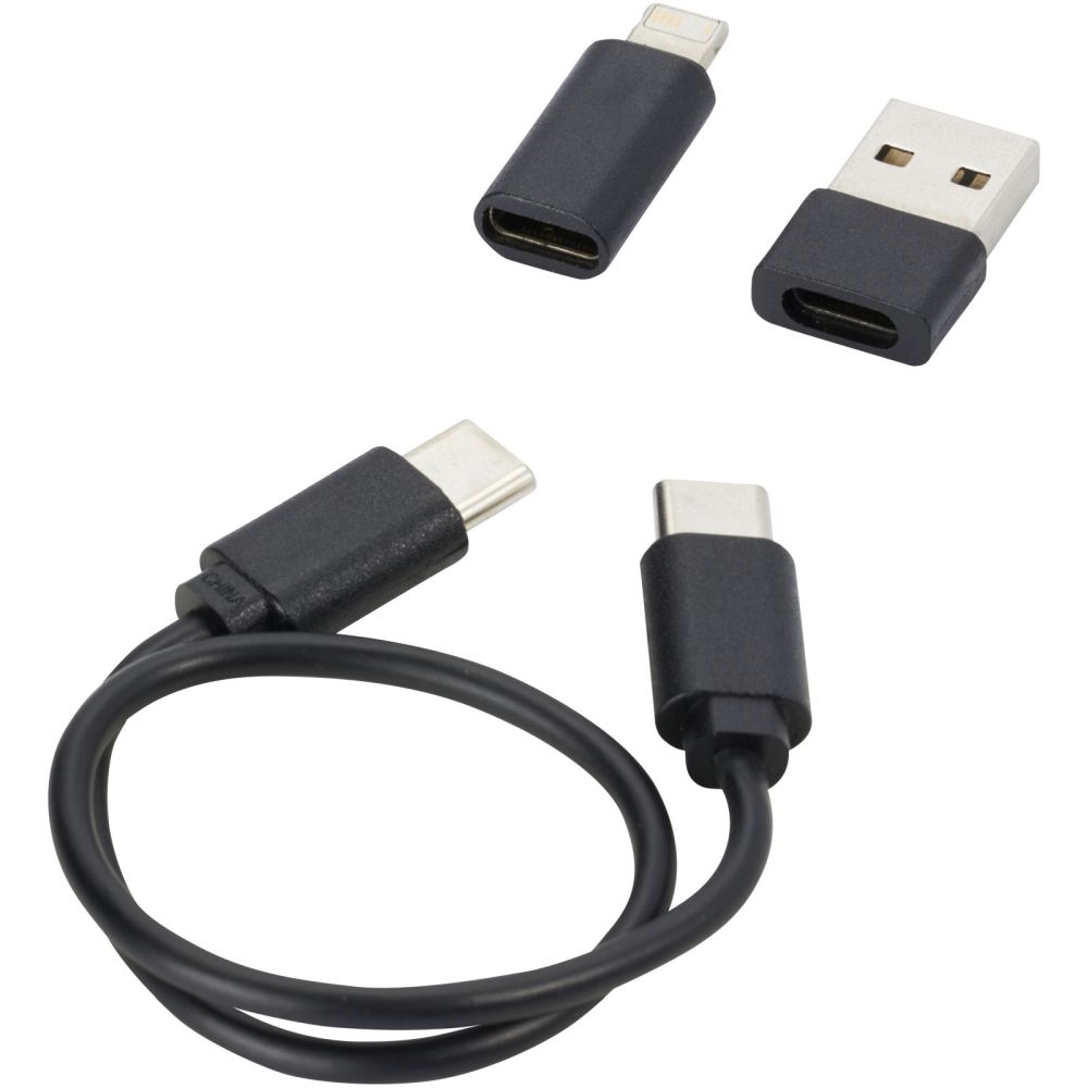 Modulární kabel pro přenos dat a nabíjení vyrobený z recyklovaného plastu, dodávaný v elegantním úložném boxu. Kabel nabízí několik řešení nabíjení: Vstup Typ-C a USB-A a výstup Typ-C/iOS/mikro USB. Díky všem těmto adaptérům a konektorům umožňuje tento kabel nabíjet většinu smartphonů, fotoaparátů, power bank, sluchátek atd. Kabel má maximální výstupní proud 2A. Obsahuje vysunovací kolík, který se hodí, kdykoli potřebujete vyjmout SIM kartu telefonu. Úložný box má také prostor pro uložení paměťové karty micro SD a nano SIM karty, což z něj dělá perfektní cestovní doplněk. Délka kabelu: 28 cm. Dodáváno v obálce ze 100% recyklovaného kraftového papíru. Rozměry: 10,5 x 1,5 x 1,5 cm.