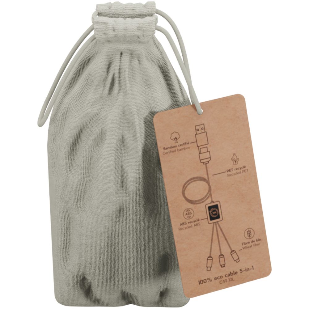 2,4A rychlonabíjecí kabel (3 × 10 cm), který lze přizpůsobit pomocí svítícího loga na obou stranách, které může být každé jiné. Tento kabel je celý vyroben z udržitelnějších materiálů: recyklované PET šňůry, bambus, pšeničná vlákna a recyklovaný plast. Nabíjecí kabel je díky svým 3 výstupům (typ C, Android, iPhone) univerzální a dokáže nabíjet až tři zařízení současně. Díky dvojitému USB a USB-C vstupu je tento kabel kompatibilní s nejnovějšími nabíječkami. Dodáváno v bavlněném sáčku (20 × 8 cm) s kartou z kraftového papíru. Rozměry: 20 x 2 x 8 cm.