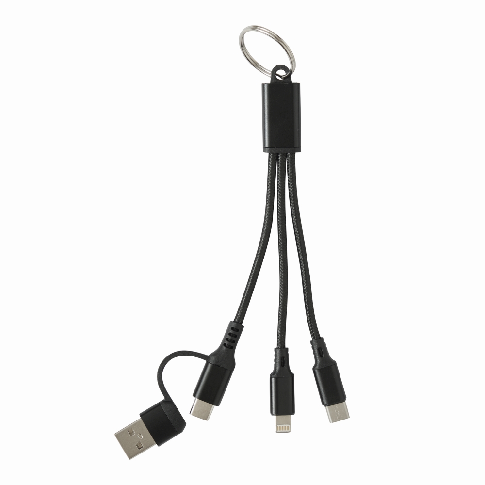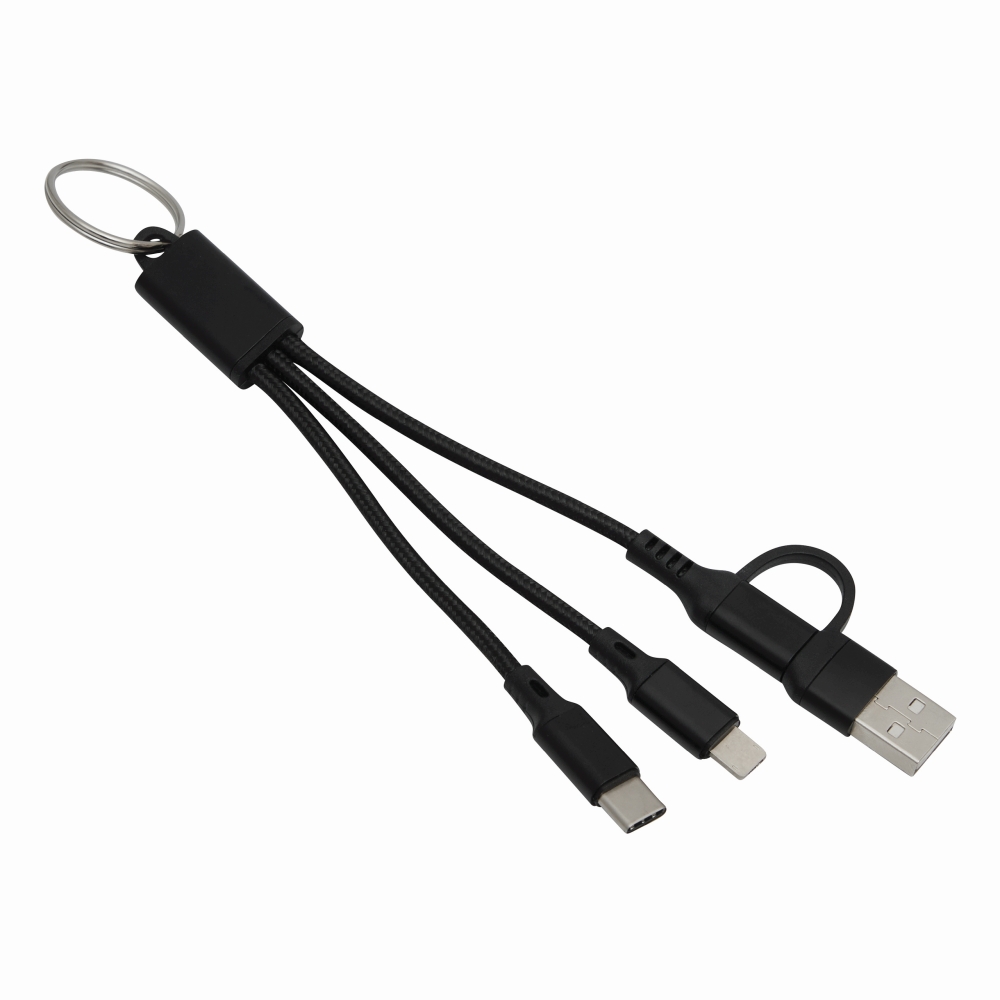Nabíjecí kabel pro nabíjení elektronických zařízení, délka cca. 18 cm, s kroužkem na klíče, vč. 2 nabíjecí konektory: USB Type-C a kombinovaný konektor Micro-USB / Lightning, vstupní konektor USB Type-C, adaptér pro USB Type-A18 x 1,5 x 0,6 cm. Rozměry: 18 x 1,5 x 0,6 cm