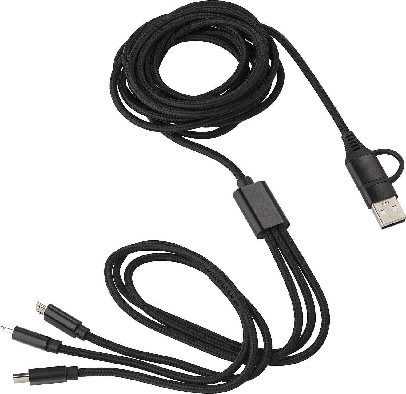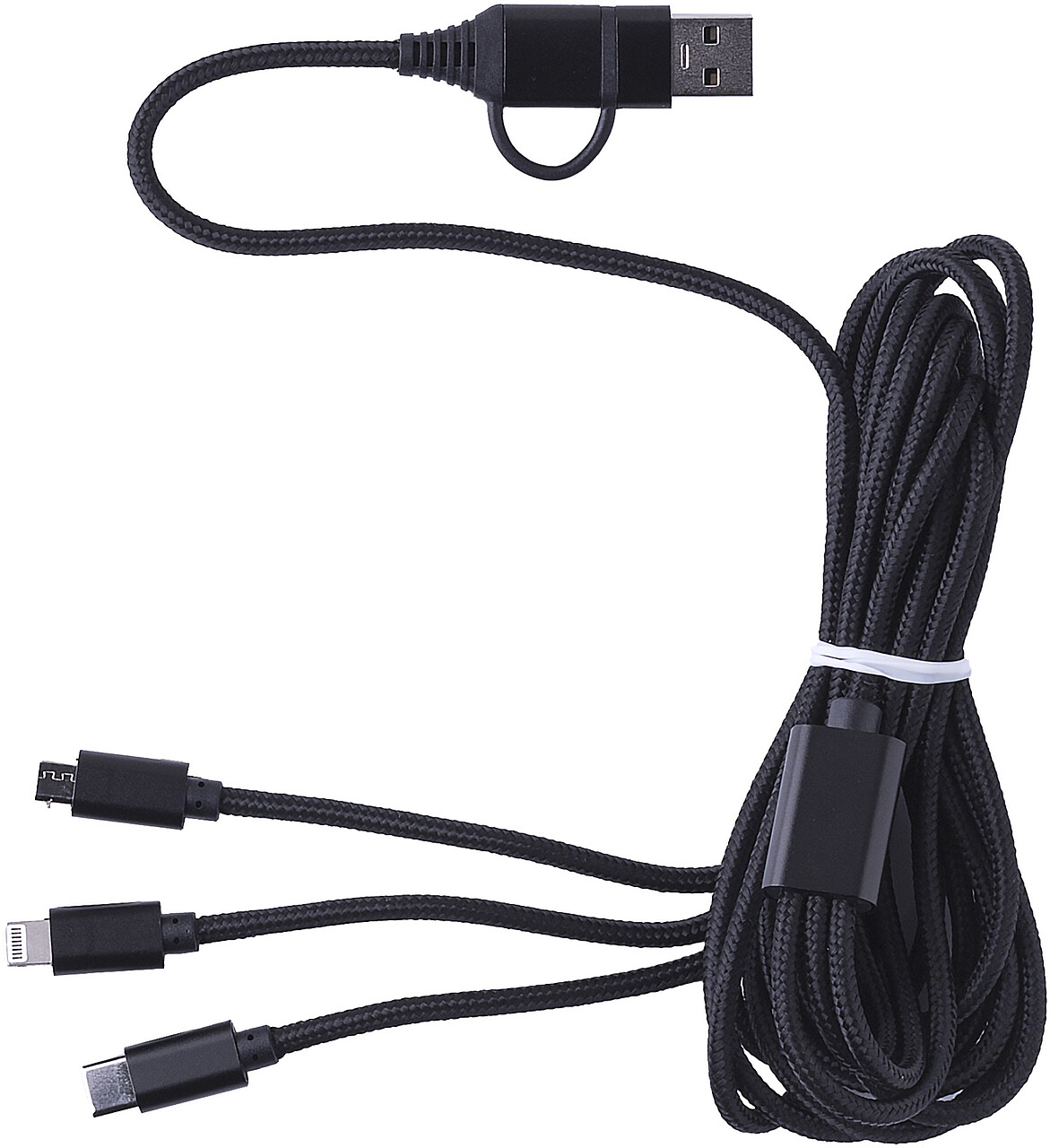 Nylonový nabíjecí kabel, délka 290 cm, rychlost 1.5A. Vstup USB A+C. Výstup mikro, typ C a lightning na obou stranách. Rozměry: 290 × 1,5 × 0,4 cm. Cena nezahrnuje recyklační poplatek.