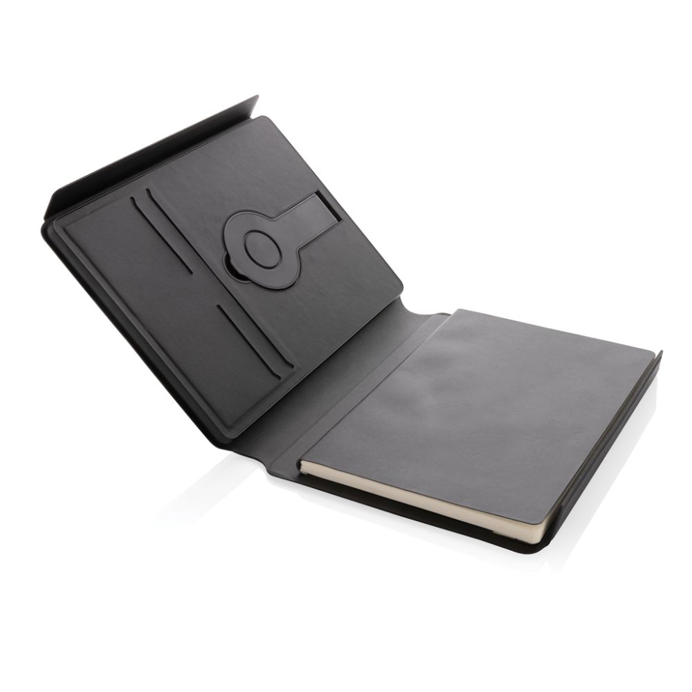 Luxusní zápisník se skládací 10 W bezdrátovou nabíječkou 2 v 1 vhodnou pro bezdrátové nabíjení telefonu a chytrých hodinek Apple watch. Včetně integrované powerbanky s kapacitou 5 000 mAh. Obal vyrobený z RCS recyklovaného PU. RCS (Recycled Claim Standard) je globální standard, který umožňuje ověřit použití recyklovaného materiálu v produktu napříč celým dodavatelským řetězcem. Celkový podíl recyklátu dle váhy produktu: 8 %. Kompatibilní se všemi zařízeními podporujícími Qi jako jsou nejnovější generace Android a iPhone 8 a výše. Využití magnetického přichycení pro iPhone 12 a výše. Zápisník obsahuje 64 listů/128 stran linkovaného FSC papíru s gramáží 80g/m2. Baleno v FSC kraftovém dárkovém balení. Produkt i příslušenství kompletně bez PVC. Vstup: 9V/2A. Výstup: 9V/1,67A; hodinky: 5V/0,5 A (2,5W). Rozměry: 17.5 x 22.5 x 2.5 cm.