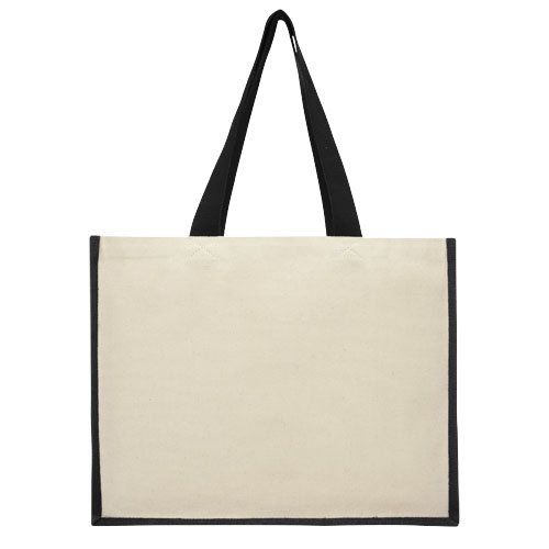 Nákupní taška s bočními díly z plátna 320 g/m2 vhodného pro potisk, s výrazným lemováním z odolné laminované juty a s bavlněnými uchy. Rozměry: 42,5 x 32 x 19 cm
