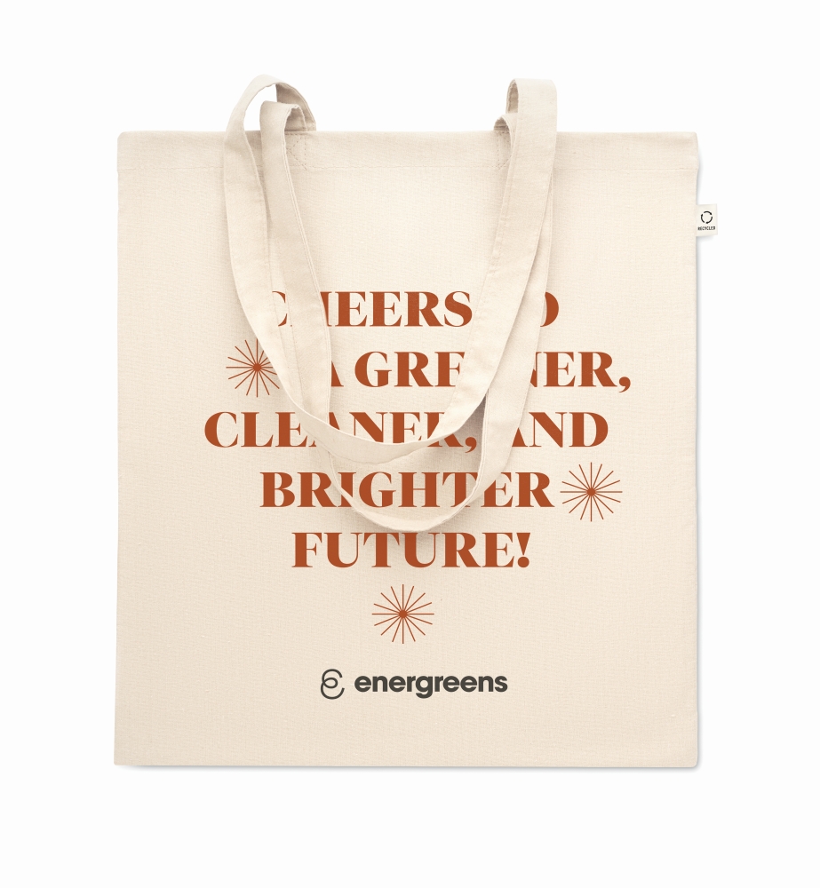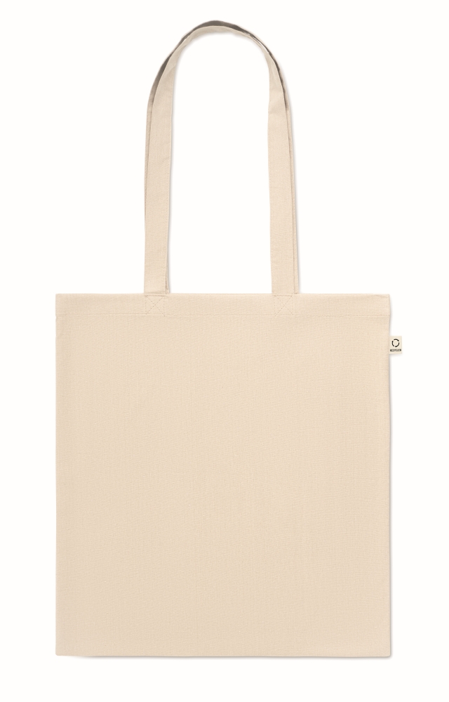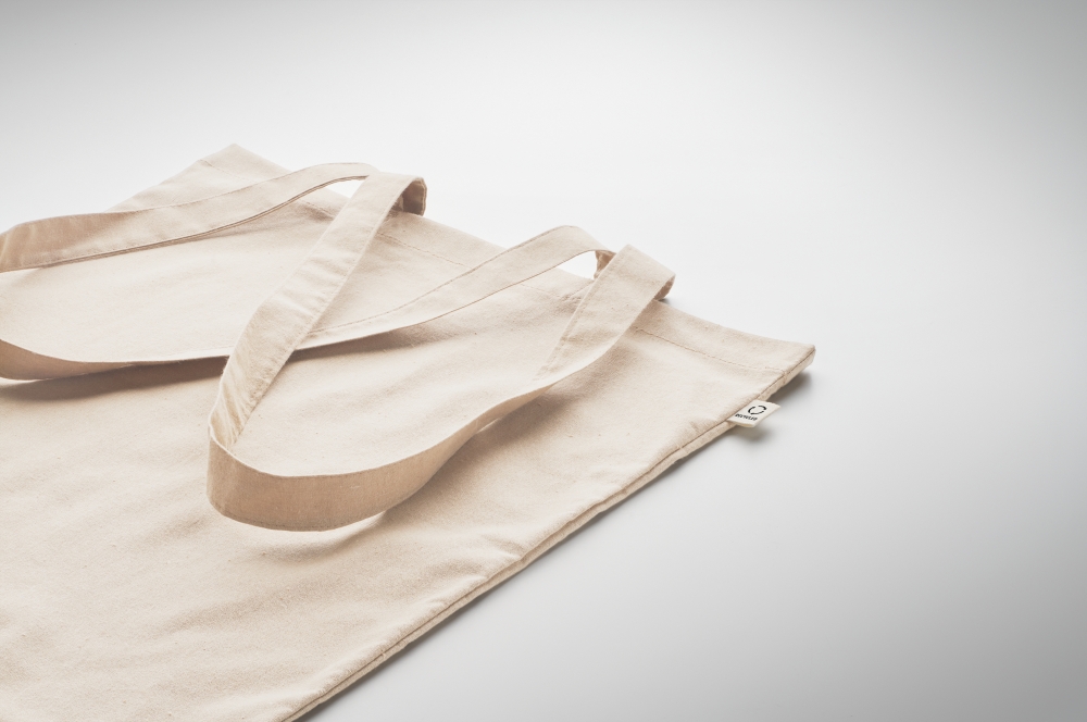 Nákupní taška z recyklované předspotřební bavlny (70 % recyklovaná bavlna a 30 % RPET) s dlouhými uchy. 140 gr/m2. Rozměry: 38 x 42 cm. Materiál: recyklovaná bavlna