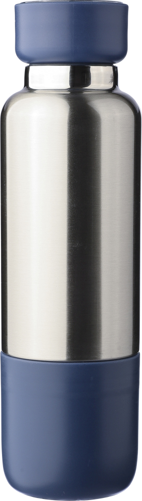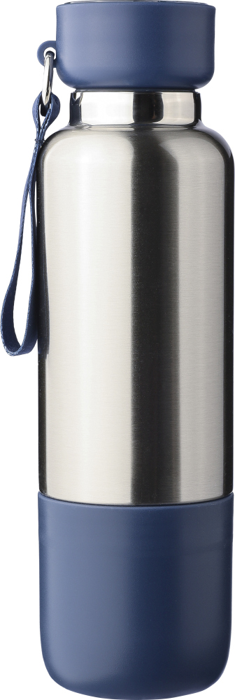 Dvoustěnná nerezová láhev na pití (500 ml). S PP šroubovacím víčkem s průhlednou přihrádkou AS, vyměnitelnými polyesterovými popruhy na zápěstí a nošení a 200ml PP kelímkem na pití ve spodní části. Stříbrné tělo s matnými detaily. Jednotlivě baleno v hnědé kartonové krabici. Rozměry: 7,5 x 25,8 cm