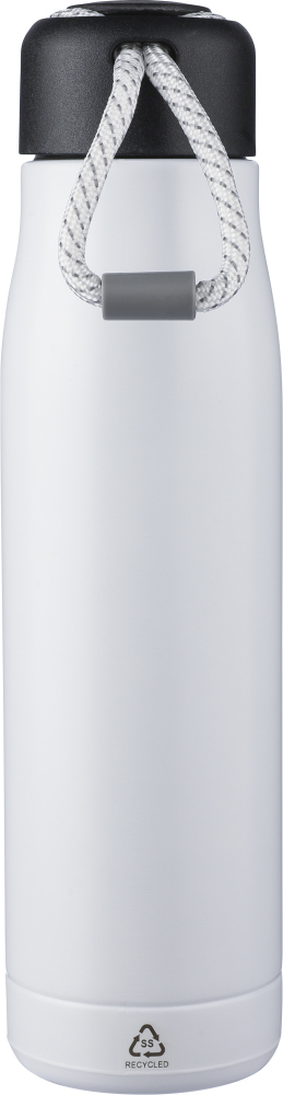 Dvoustěnná vakuová láhev z recyklované nerezové oceli (500 ml). Vybavena šroubovacím víčkem z PP a polyesterovou šňůrkou. Určena pro izolaci a každodenní použití. Součástí je gravírované recyklované logo. Jednotlivě baleno v hnědé kartonové krabici. Rozměry: 7 x 25,8 cm
