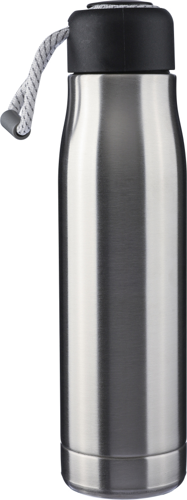 Dvoustěnná vakuová láhev z recyklované nerezové oceli (500 ml). Vybavena šroubovacím víčkem z PP a polyesterovou šňůrkou. Určena pro izolaci a každodenní použití. Součástí je gravírované recyklované logo. Jednotlivě baleno v hnědé kartonové krabici. Rozměry: 7 x 25,8 cm
