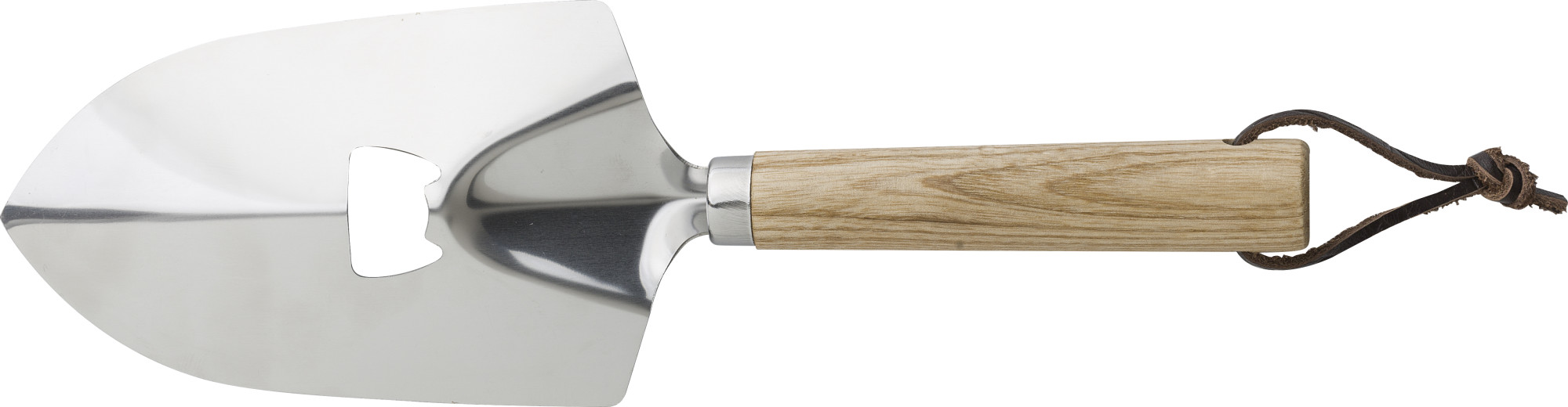 Nerezová zahradní lopatka, s dřevěnou rukojetí. Uprostřed lopatkové části je otvírák na lahve. Rozměry: 28.5 x 8 x 2.8 cm