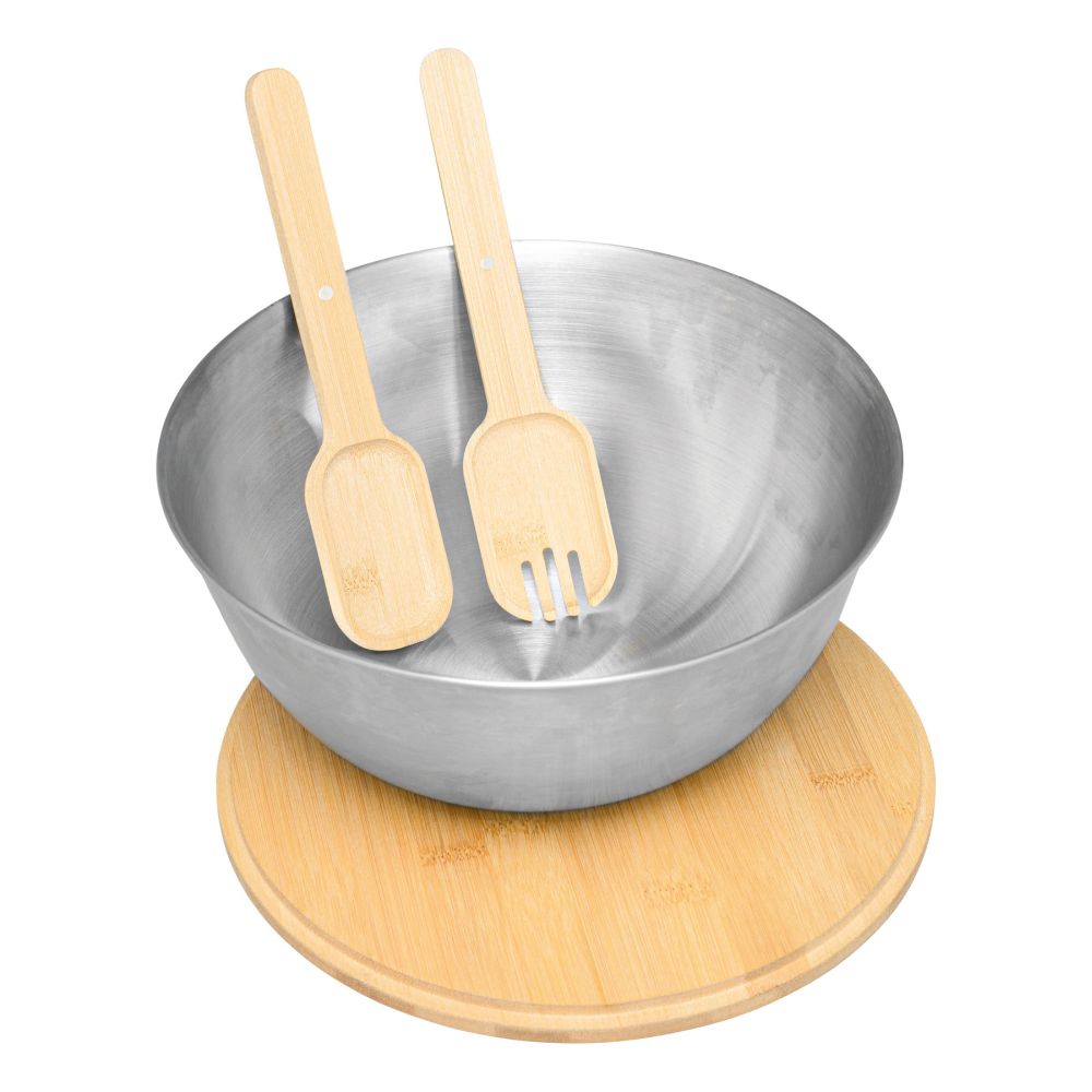 Salátová mísa z nerezové oceli s bambusovým víčkem. Součástí víčka je i servírovací náčiní, které ve víku drží pomocí magnetu. Objem mísy je cca 3 l. Rozměry: O24,5 x 12 cm