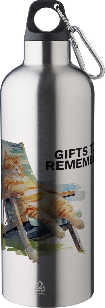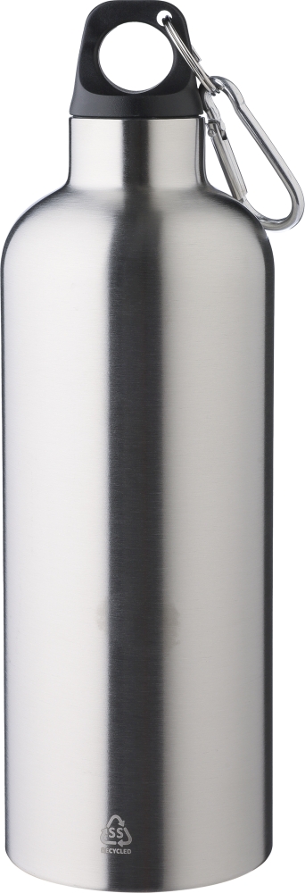 Dvoustěnná láhev z recyklované nerezové oceli s objemem 500 ml, víčkem z PP a hliníkovou karabinou. Udrží nápoje teplé 8 hodin a studené 12 hodin. Láhev má matný povrch (kromě stříbrné barvy) a je opatřena recyklovaným laserovým logem. Jednotlivě baleno v hnědé kartonové krabici. Výška: 23 cm