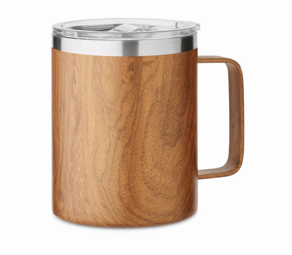 Nerezový dvoustěnný hrnek v dřevěném vzhledu, 300ml, plastové víčko