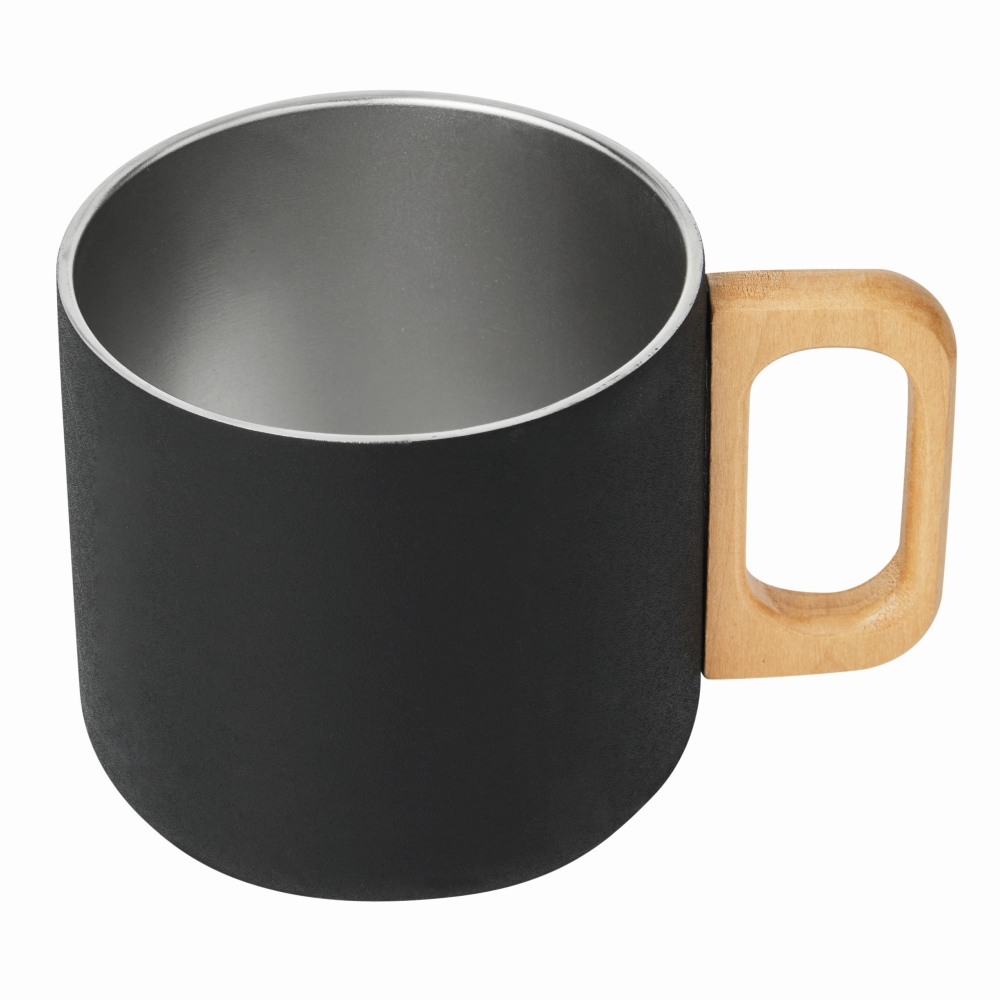 Nerezový hrnek, dvoustěnný s dřevěnou rukojetí, barevný matný práškový lak na vnější straně a stříbrný na vnitřní straně, kapacita cca. 350 ml. Rozměry: O8,5 x 8 cm