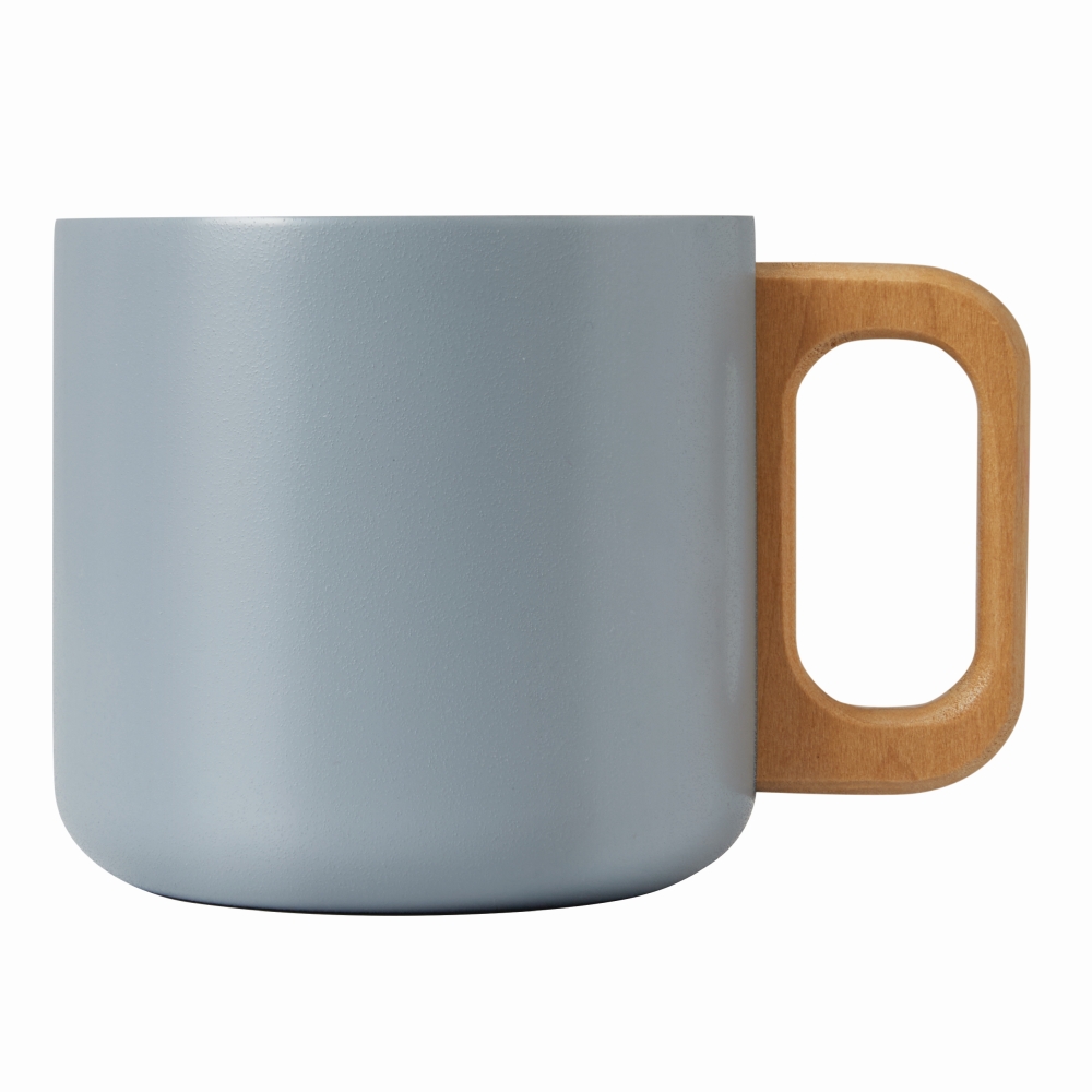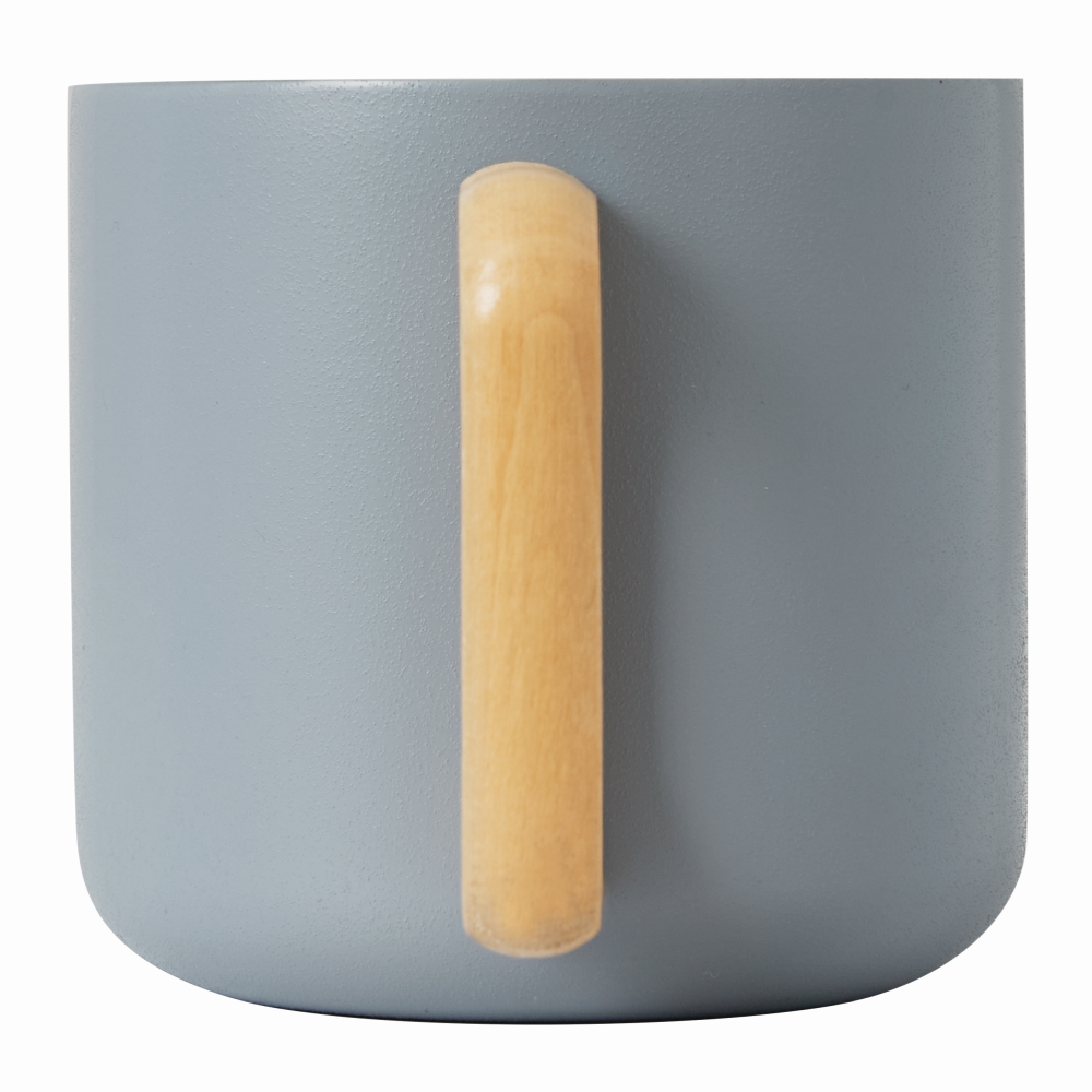 Nerezový hrnek, dvoustěnný s dřevěnou rukojetí, barevný matný práškový lak na vnější straně a stříbrný na vnitřní straně, kapacita cca. 350 mlO8,5 x 8 cm. Rozměry: O8,5 x 8 cm