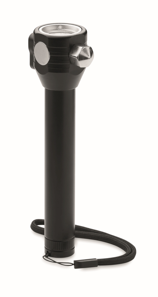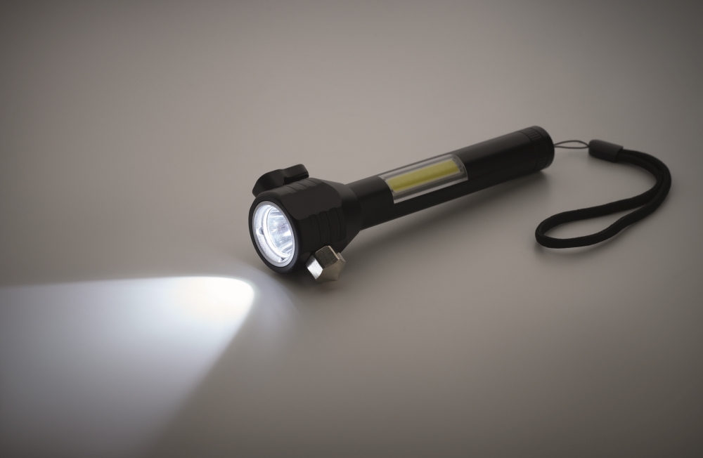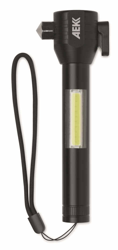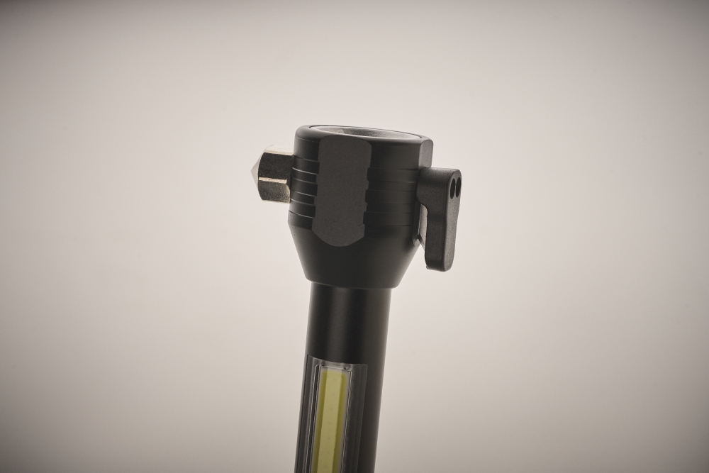 Hliníková svítilna 3v1 s nouzovým kladívkem a řezačem bezpečnostních pásů. Má boční a přední COB světlo. Včetně magnetu a popruhu na ruku. Vestavěná dobíjecí baterie 500 mAh. Rozměry: 16,1 x 5,8 cm. Materiál: hliník
