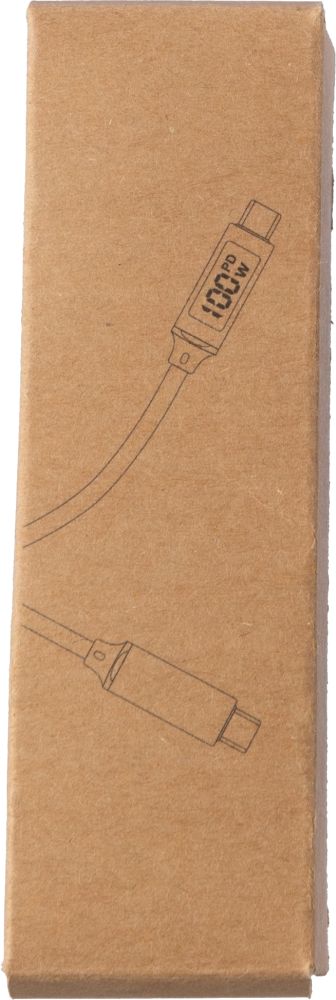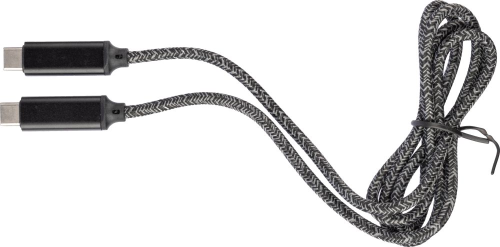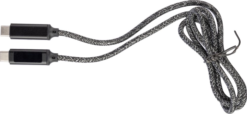 Nylonový nabíjecí kabel s hliníkovými zdířkami. USB-C na USB-C. Kapacita: 100 W. Modrá kontrolka indikace rychlosti nabíjení na jedné zásuvce. Jednotlivě baleno v hnědé kartonové krabici. Rychlost přenosu dat 480 Mbps. Materiál: nylon Rozměry: 1,2 x 100 cm
