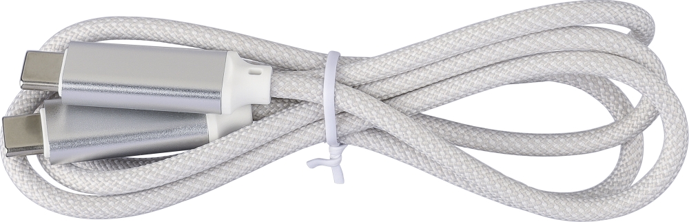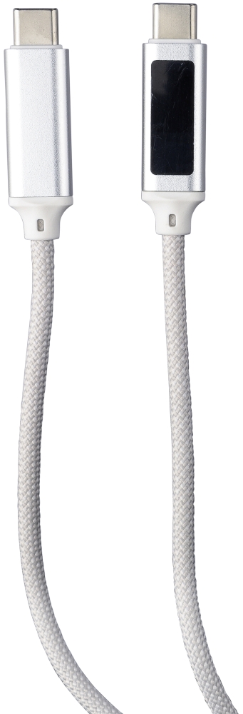 Nylonový nabíjecí kabel s hliníkovými zdířkami. USB-C na USB-C. Kapacita: 100 W. Modrá kontrolka indikace rychlosti nabíjení na jedné zásuvce. Jednotlivě baleno v hnědé kartonové krabici. Rychlost přenosu dat 480 Mbps. Materiál: nylon Rozměry: 1,2 x 100 cm