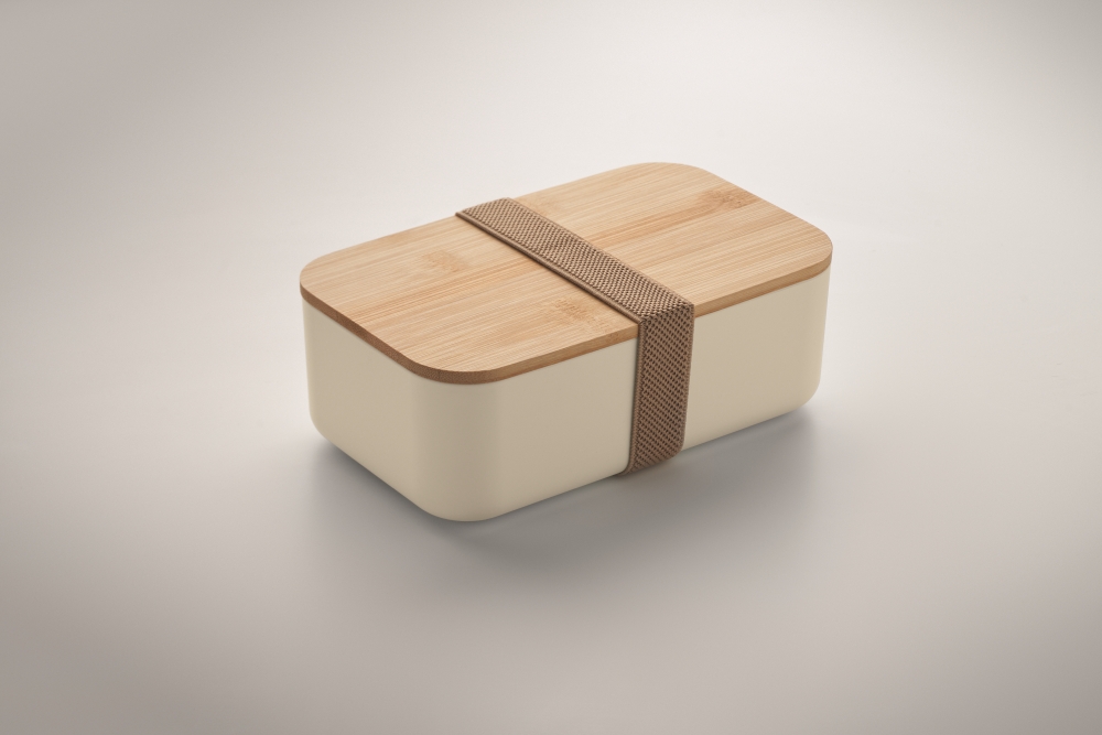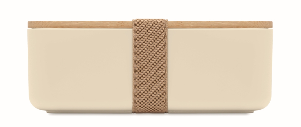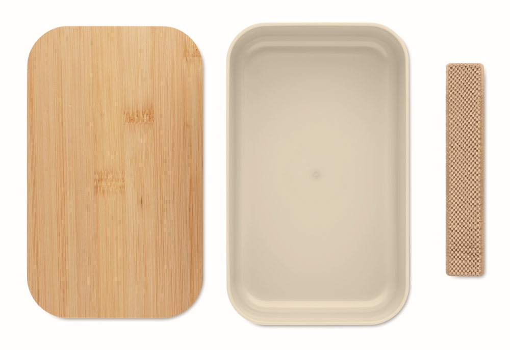 Obědová krabička ze 100% PLA kukuřice s bambusovým víčkem a elastickým uzávěrem z RPET. Objem: 1000 ml. Rozměry: 19 x 12 x 6,5 cm. Materiál: PET