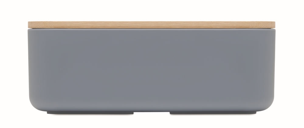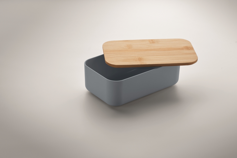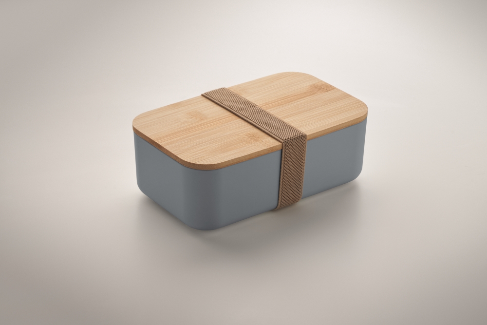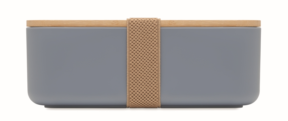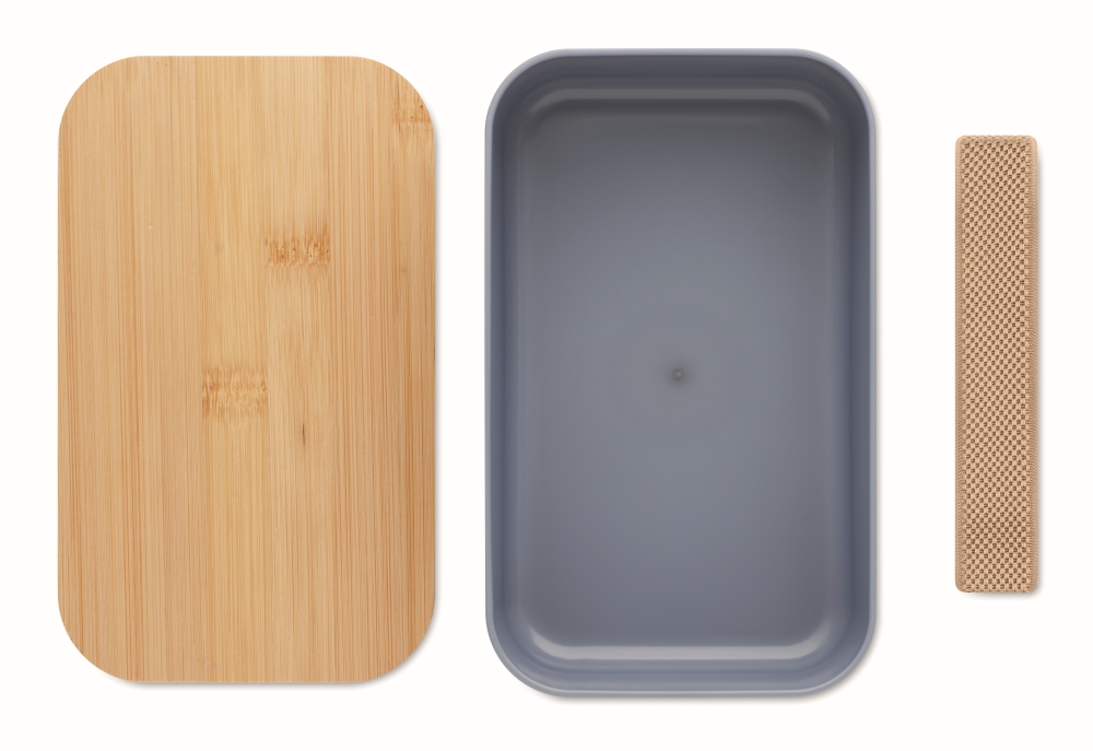 Obědová krabička ze 100% PLA kukuřice s bambusovým víčkem a elastickým uzávěrem z RPET. Objem: 1000 ml. Rozměry: 19 x 12 x 6,5 cm. Materiál: PET