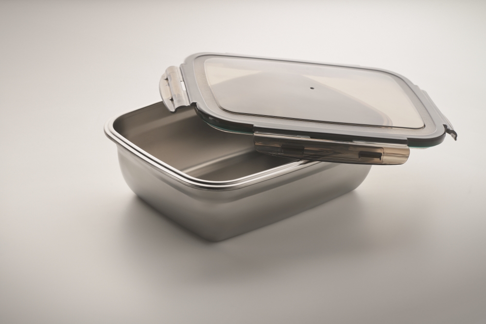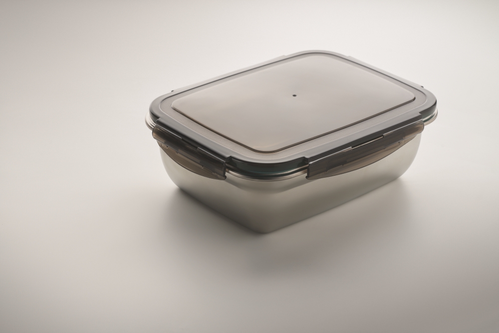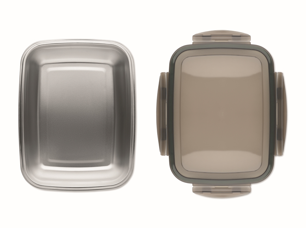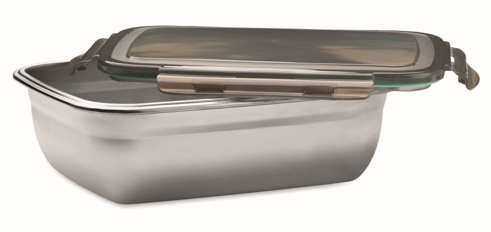 Krabička na jídlo z recyklované nerezové oceli s víčkem z recyklovaného PP. Zavírání na 4 strany. Objem: 1500 ml. Rozměry: 22,5 x 17 x 7,6 cm. Materiál: nerezová ocel