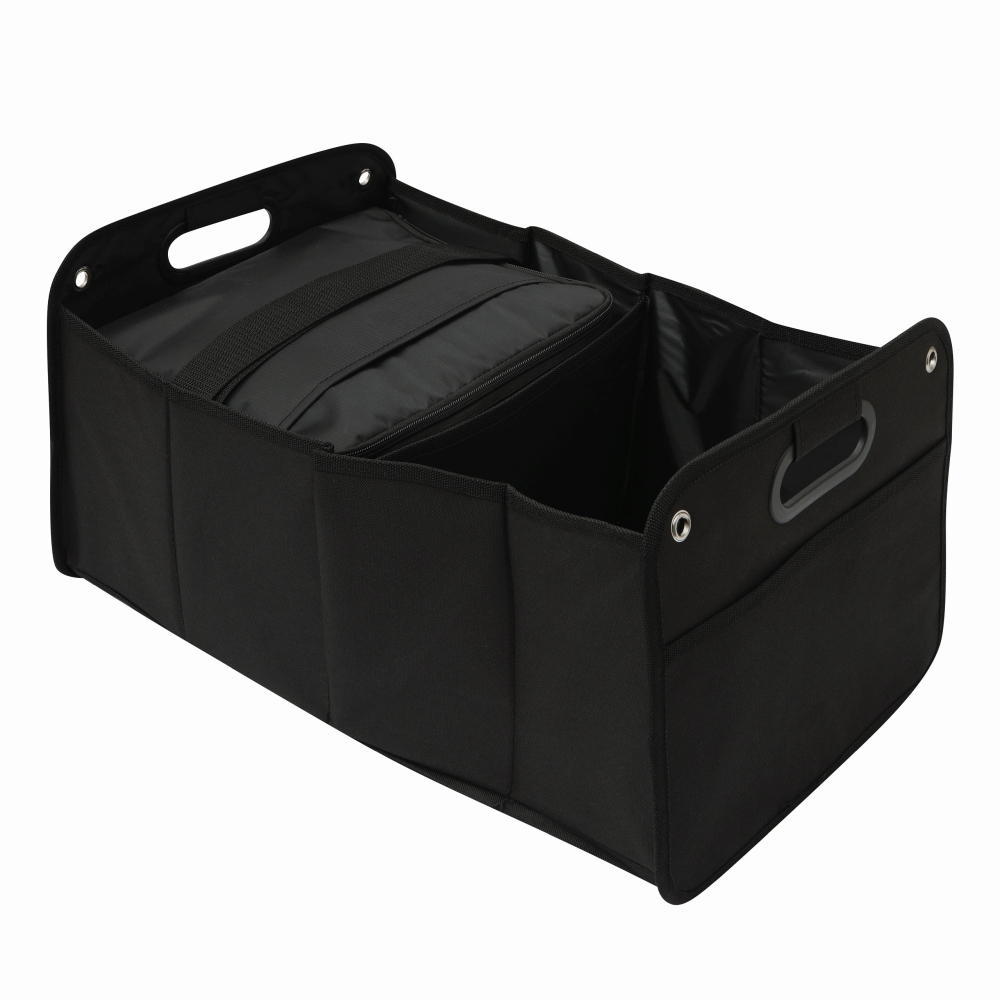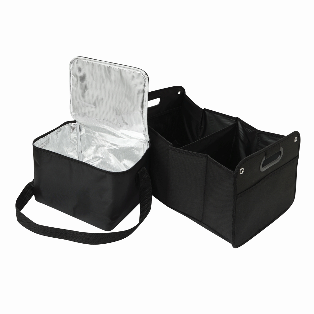 Organizér do kufru do auta: 1.) samostatně vyjímatelná chladicí taška s nastavitelným ramenním popruhem a kapsou na víku, 2.) velká skládací taška se 2 přihrádkami a policí pro dostatek úložného prostoru , stejně jako síťovaná kapsa, 2 integrovaná ucha na přenášení, se suchým zipem na podlaze pro nejlepší držení v kufru a 4 kovová upevňovací očka - při nepoužívání s elastickým páskem Skládací pro úsporu místa - obě tašky lze používat i nezávisle na sobě, chladicí tašku lze přesně uložit do kufru. Rozměry: cca 32 x 26 x 52 / 28 x 23 x 19 cm