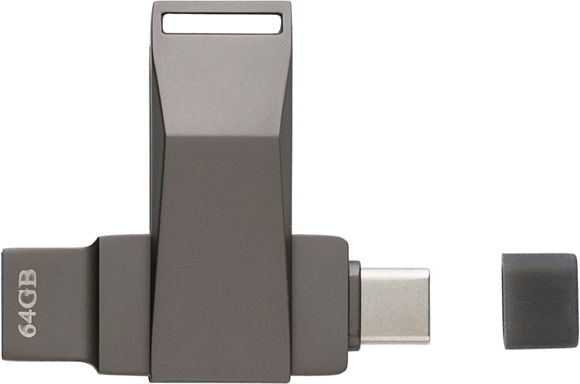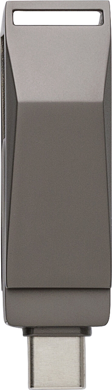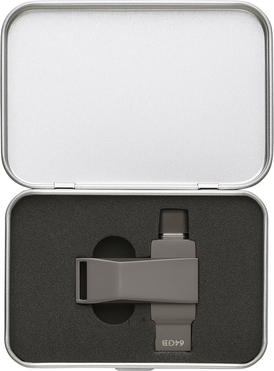 Otočný USB flash disk vyrobený ze zinkové slitiny s matným grafitovým povrchem. Kapacita 64 GB, s otočnou funkcí pro USB-A a USB-C. Baleno v kovovém pouzdře. Rozměry: 5,6 × 1,5 × 1,2 cm. Cena nezahrnuje recyklační poplatek a autorskou odměnu.