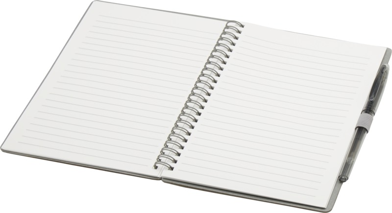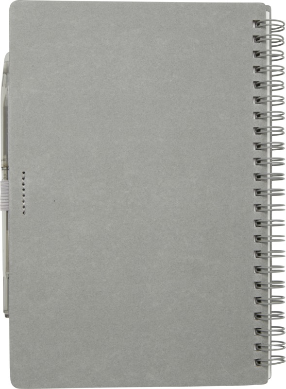 Sada zápisníku z kamenného papíru pro opakované použití a kuličkového mazacího pera z recyklovaného plastu s průhledným tělem, gumou a černou náplní. Zápisník má obálku z lepenky a 32 linkovaných listů o gramáži 120 g/m2. Na zadní straně je kapsa na černý hadřík, který je součástí balení. Rozměry: 14 × 21 cm.