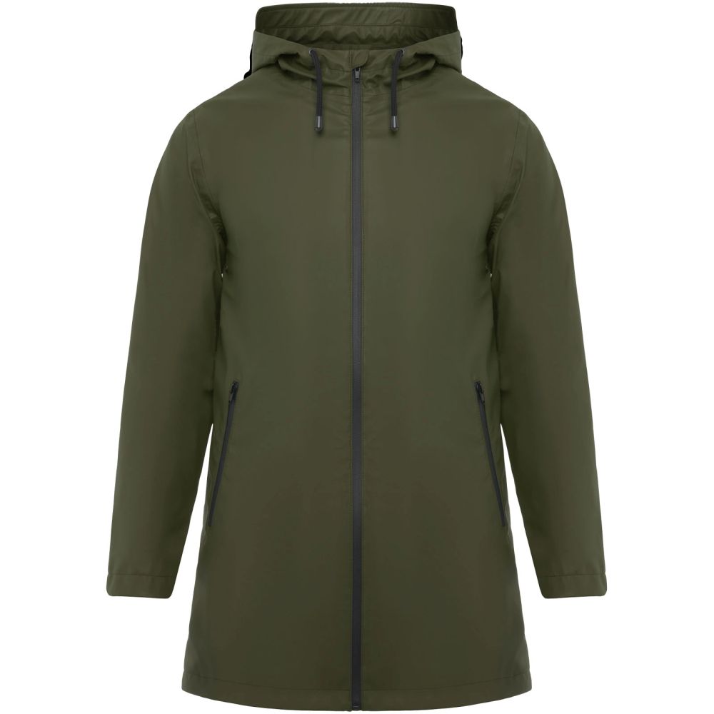 Nepromokavá pláštěnka. Kapuce s kšiltem. Zateplené zipy a švy. Kontrastní detaily v černé barvě. Dvě boční kapsy na zip. Rozparky na zadním lemu. Odnímatelný štítek. Nepromokavá. Modelka měří 185 cm a má na sobě velikost M.