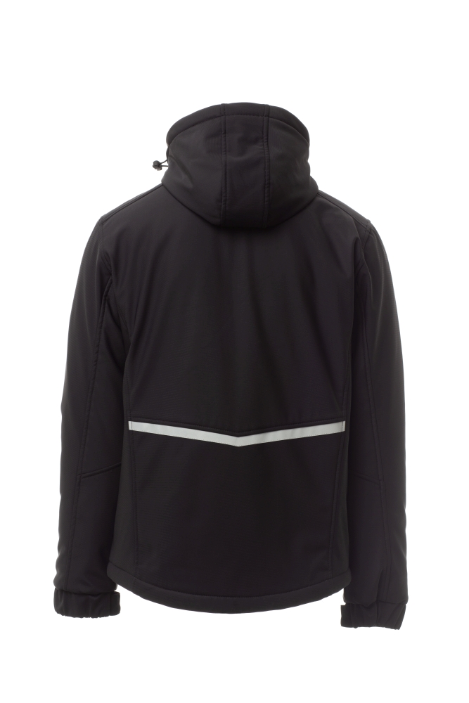 Pánský softshell s lehkým polstrováním 100g/m2, zapínání na zip SBS s kovovým jezdcem „semi-auto lock“ a přizpůsobeným taháčkem. Odnímatelná kapuce se stahovací šňůrkou. Reflexní pruhy v zadní části pásku a zadní straně kapuce. Elastické stahovací manžety na suchý zip. Dvě boční kapsy na zip, jedna kapsa na hrudi na voděodolný zip a jedna kapsa na levé paži s integrovanou kapsičkou na pero na zip. Fluorescentní taháčky. Jedna vnitřní prostřižená kapsa na suchý zip. Spodní část stažitelná pomocí přizpůsobených zarážek. Vlastnosti: WP 8000 mm H2O, WVT 5000 g/m2 24h.