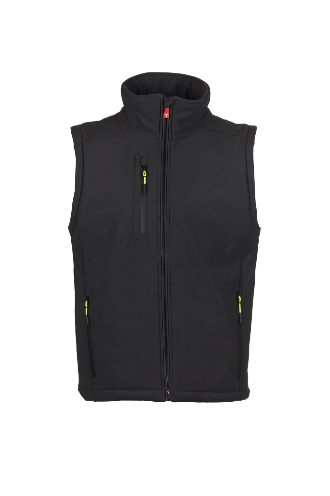 Pánská softshellová vesta s lehkým polstrováním 100g/m2, zapínání na zip SBS s kovovým jezdcem „semi-auto lock“ a přizpůsobeným taháčkem. Reflexní pruh na zadní části pásku. Dvě boční kapsy na zip, jedna kapsa na hrudi s voděodolným zipem. Fluorescentní taháčky. Jedna vnitřní prostřižená kapsa na suchý zip. Spodní část stažitelná pomocí přizpůsobených zarážek. Vlastnosti: WP 8000 mm H2O, WVT 5000 g/m2 24h.