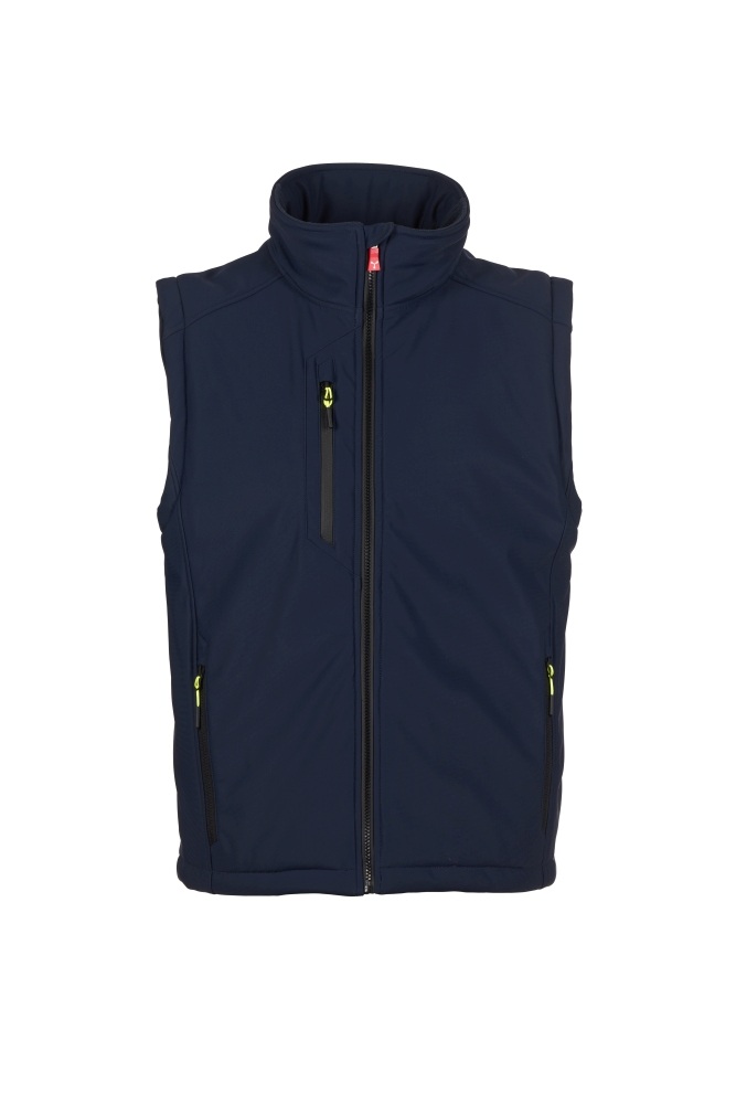 Pánská softshellová vesta s lehkým polstrováním 100g/m2, zapínání na zip SBS s kovovým jezdcem „semi-auto lock“ a přizpůsobeným taháčkem. Reflexní pruh na zadní části pásku. Dvě boční kapsy na zip, jedna kapsa na hrudi s voděodolným zipem. Fluorescentní taháčky. Jedna vnitřní prostřižená kapsa na suchý zip. Spodní část stažitelná pomocí přizpůsobených zarážek. Vlastnosti: WP 8000 mm H2O, WVT 5000 g/m2 24h.