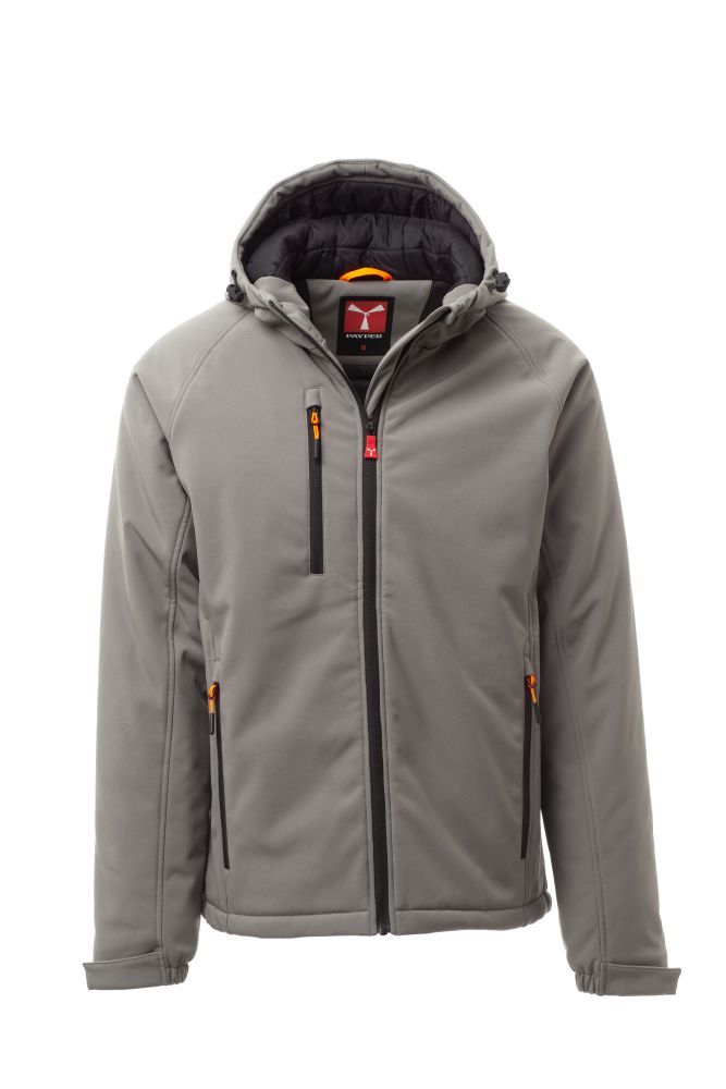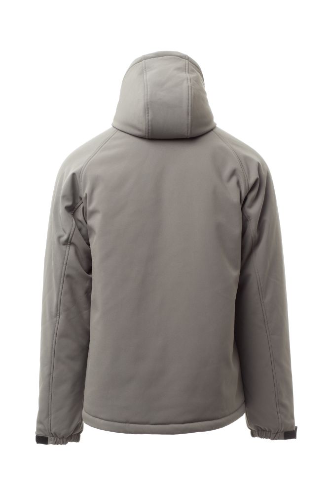 WP 8000 mm H2O, WVT 5000 g/m2 24h. Pánský zateplený softshell, zapínání na zip s kovovým jezdcem „semi-auto lock“ a přizpůsobeným taháčkem. Neodnímatelná kapuce se stahovací šňůrkou. Elastické stahovací manžety na suchý zip. Dvě boční kapsy a jedna kapsa na hrudi na zip. Fluorescenční taháčky. Dvě vnitřní kapsy: jedna tvarovaná na zip a jedna na tablet se zapínáním na suchý zip. Spodní část stažitelná pomocí přizpůsobených zarážek.