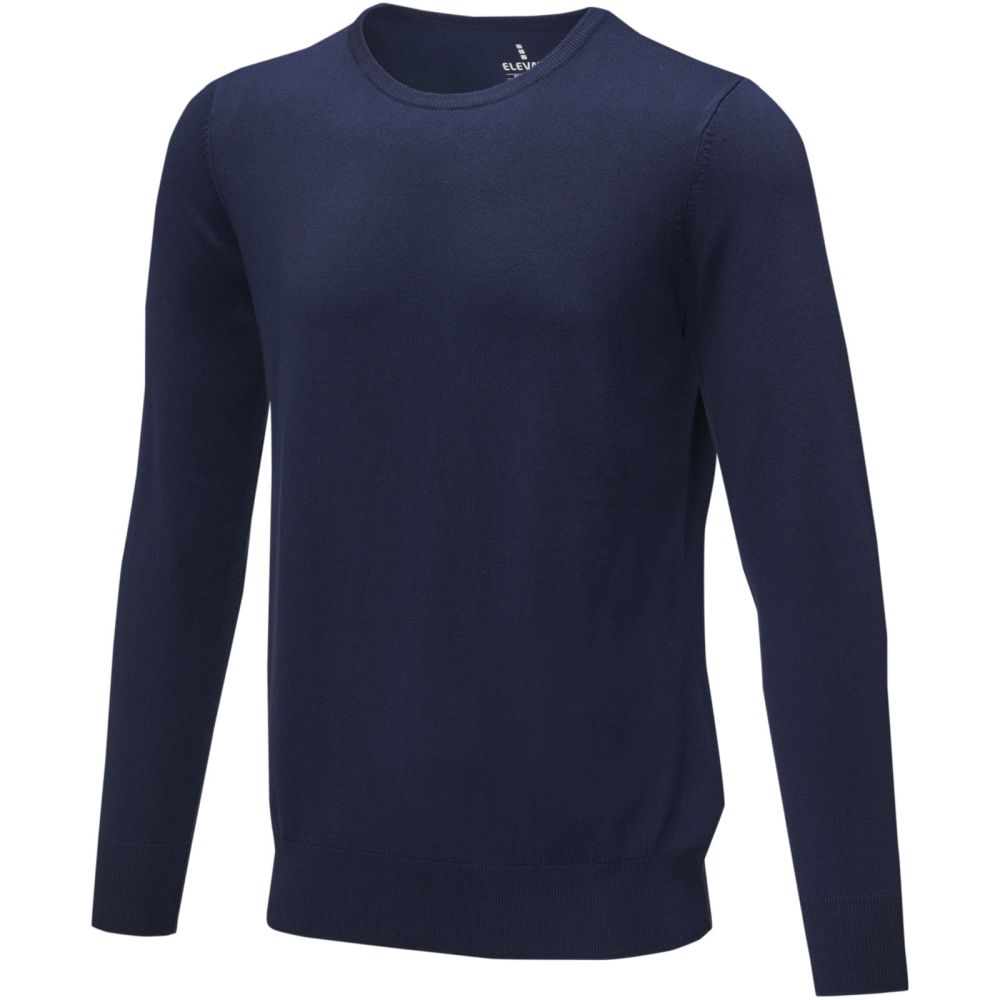 Pánský svetr s kulatým výstřihem, značka Elevate. Svetr má plochý žebrový límeček, žebrový úplet manžetek i spodního lemu, saténovou lemovku výstřihu. Plochý úplet 80% viskóza, 20% nylon.