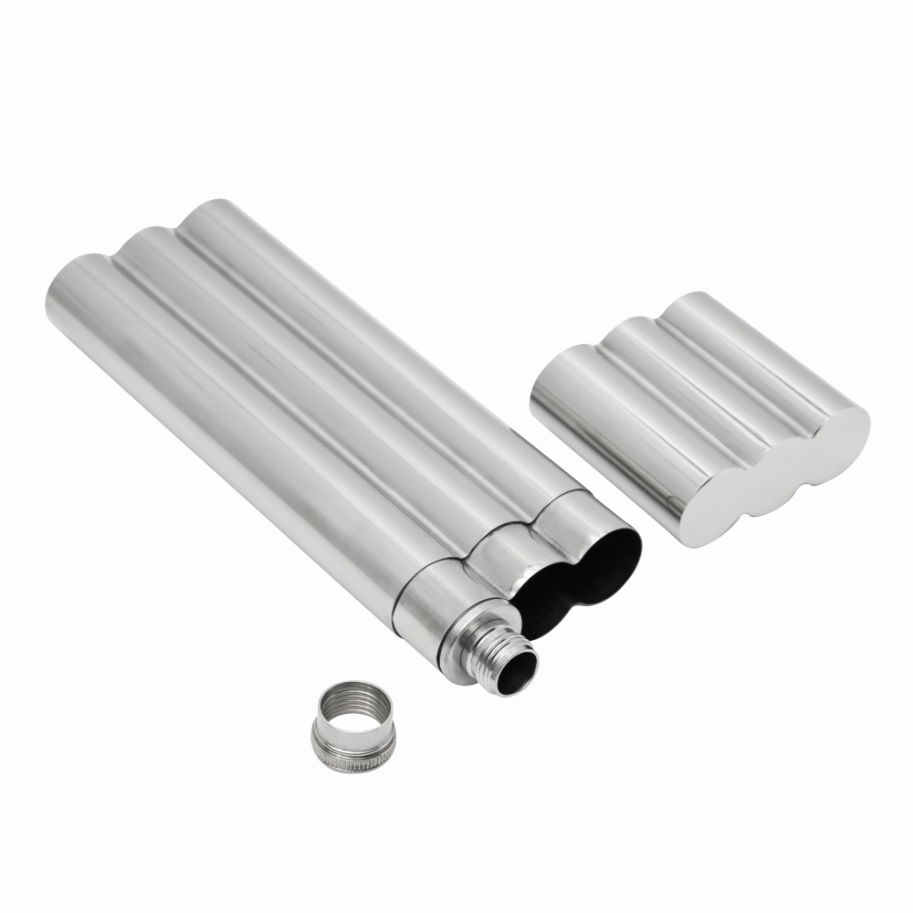 Placatka z nerezové oceli o objemu 60 ml, 2 tuby pro bezpečné skladování doutníků (vhodné pro doutníky o průměru cca 20 mm). Rozměry: 21 x 6,4 x 2,4 cm