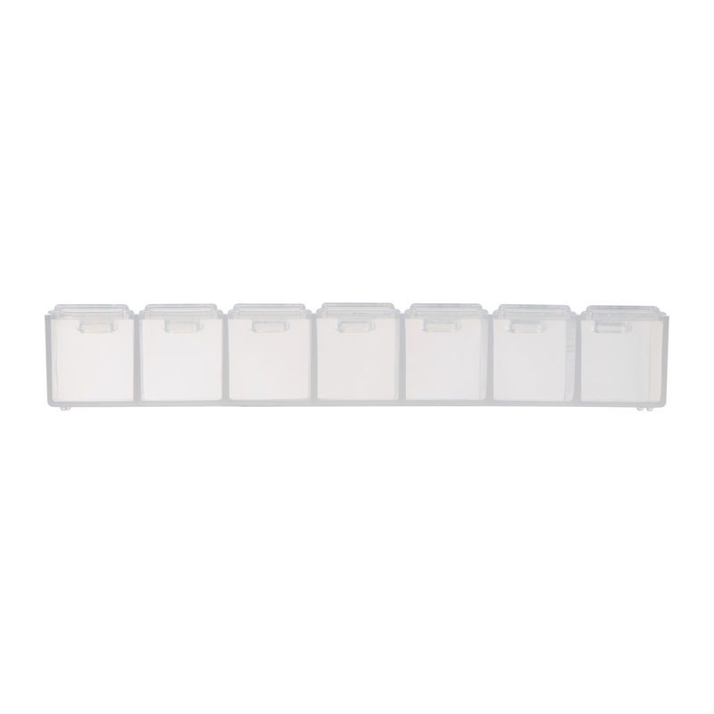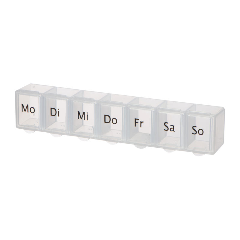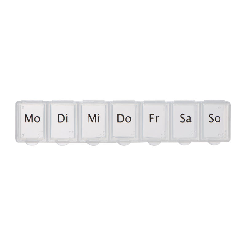 Plastový box na léky se 7 přihrádkami pro uchování léků na celý týden. Dny v týdnu jsou na krabičce označeny také v Braillově písmě. Rozměry: 15 x 3,2 x 2,5 cm