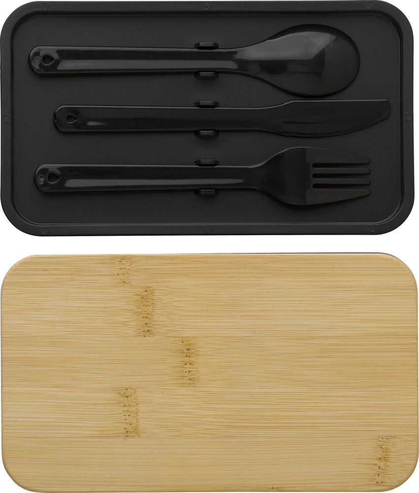 Plastový dvoupatrový box na svačinu s bambusovým víčkem stažený gumičkou. Obsahuje sadu plastových příborů: lžička, nůž a vidlička. Objem každé krabičky je 400 ml. Rozměry: 18,5 × 10,5 × 9,5 cm.