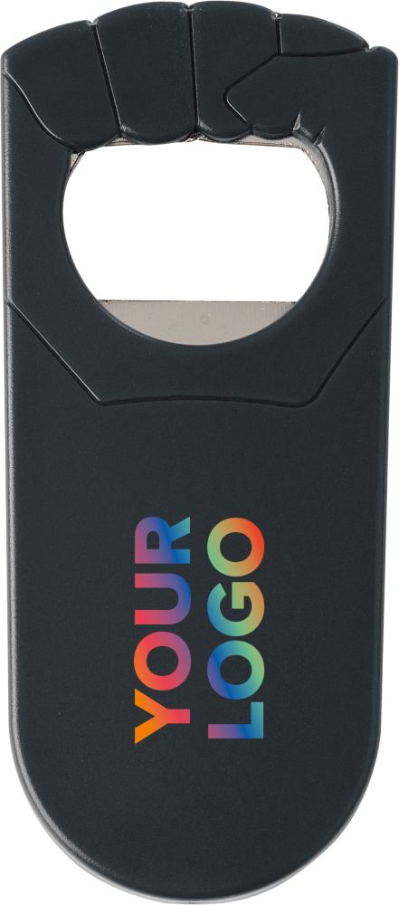 Otvírák korunkových zátek s plastovou rukojetí ve tvaru pěsti. Rozměry: 9.1 x 4.1 x 1.1 cm