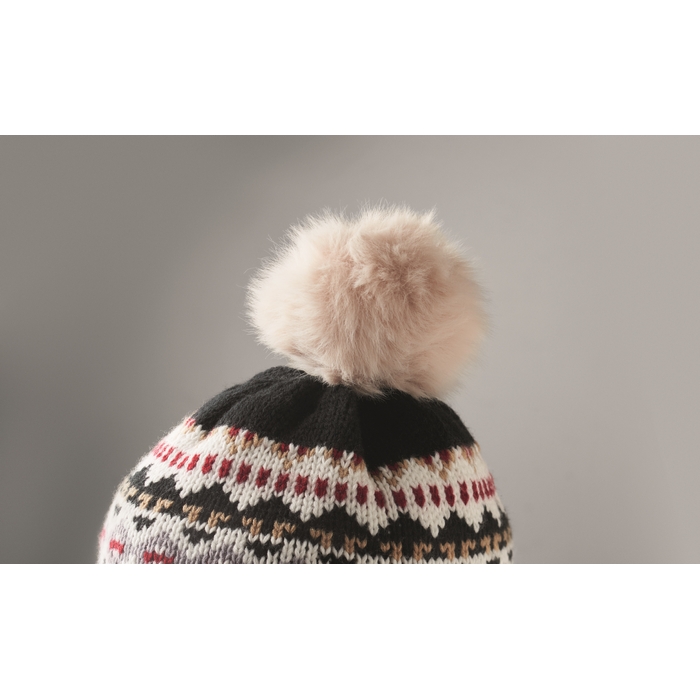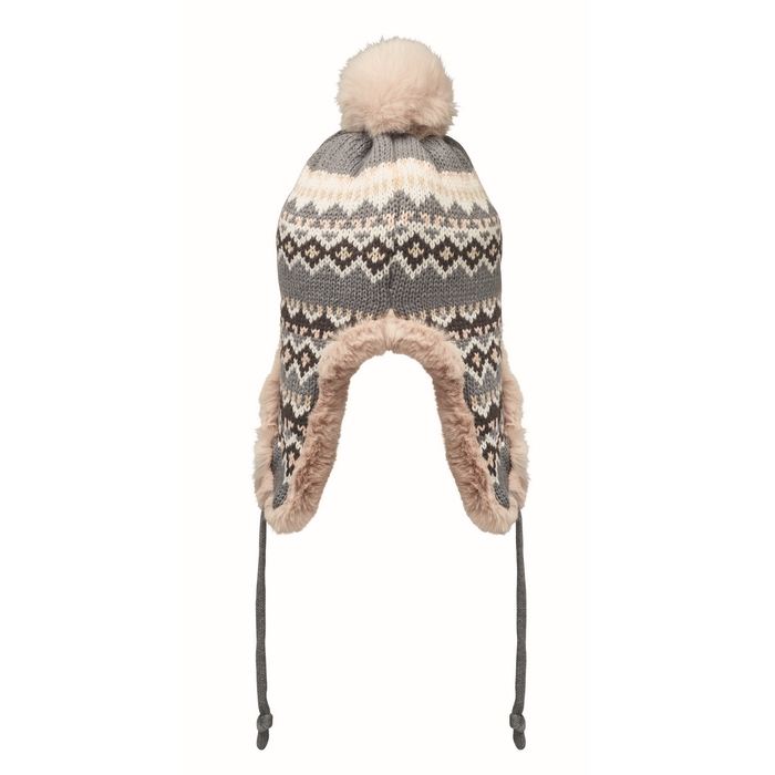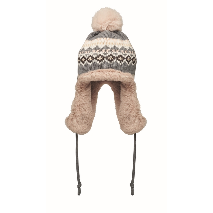 Pletená čepice s klapkami na uši a bambulí z akrylového vlákna s polyesterovou a fleecovou podšívkou. Štítek pro potisk na jedné straně. Velikost pro dospělé.Rozměry: 25 x 35cm