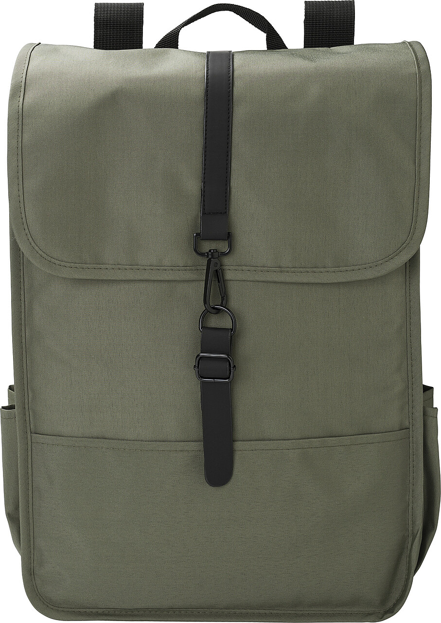 Batoh s klopou z recyklovaného 300D RPET polyesteru. Obsahuje jednu hlavní přihrádku, dvě boční kapsy na láhev a černý PU pásek se zapínáním na přezku. Rozměry: 29 × 10 × 40 cm.