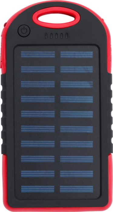 Pogumovaná solární powerbanka z ABS plastu se zelenými kontrolkami a boční svítilnou. Dva USB porty a jeden USB-C port. Solární nabíjení 5V/200mA. Vstup DC 5V/1A. Výstup DC 5V/2x1A. Kapacita: 4 000 mAh. Součástí balení je USB kabel. Rozměry: 14,4 x 7,5 x 1,5 cm