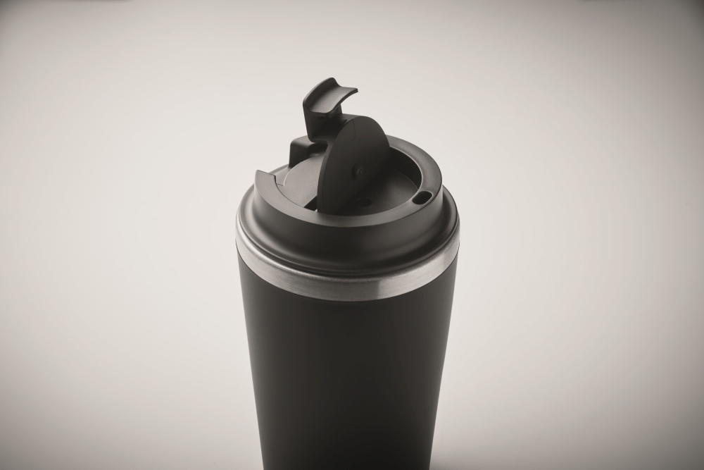 Dvoustěnný pohárek s vnější stěnou z PP a vnitřní stěnou z recyklované nerezové oceli (90 % recyklované nerezové oceli a 10 % nerezové oceli) s keramickou vrstvou. Neteče. Objem: 350 ml. Rozměry: O 8,5 x 14 cm