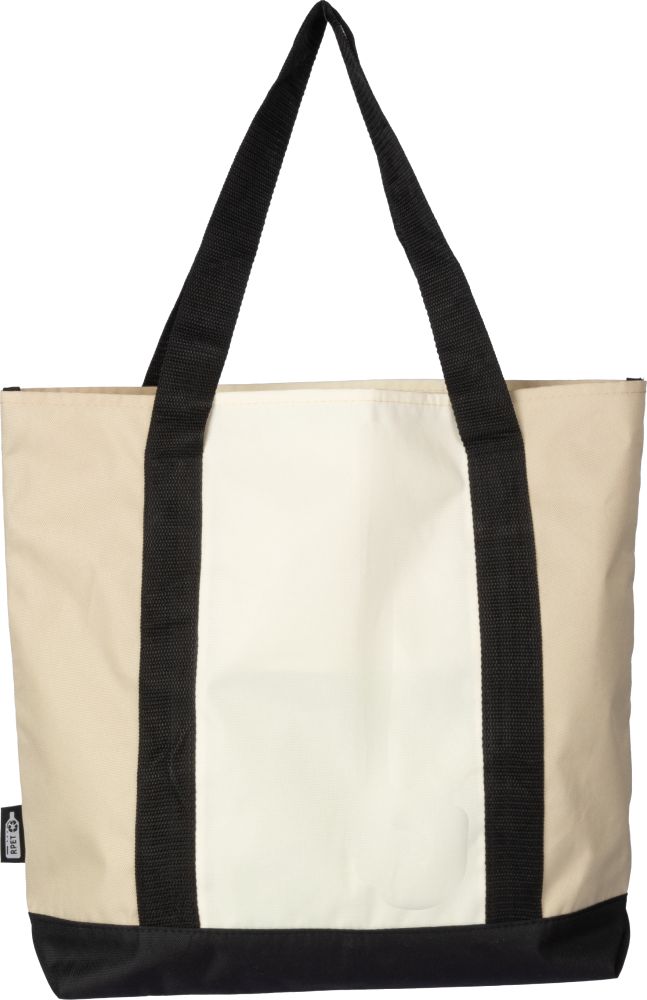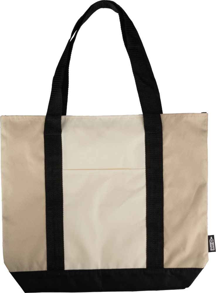 rPET (600D) taška s velkou kapsou na zip na horní straně a otevřenou kapsou na přední straně. S dlouhými rukojeťmi. Materiál: RPET Rozměry: 410 x 180 x 340 mm