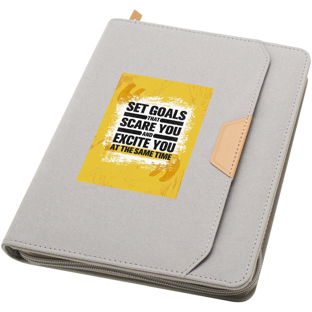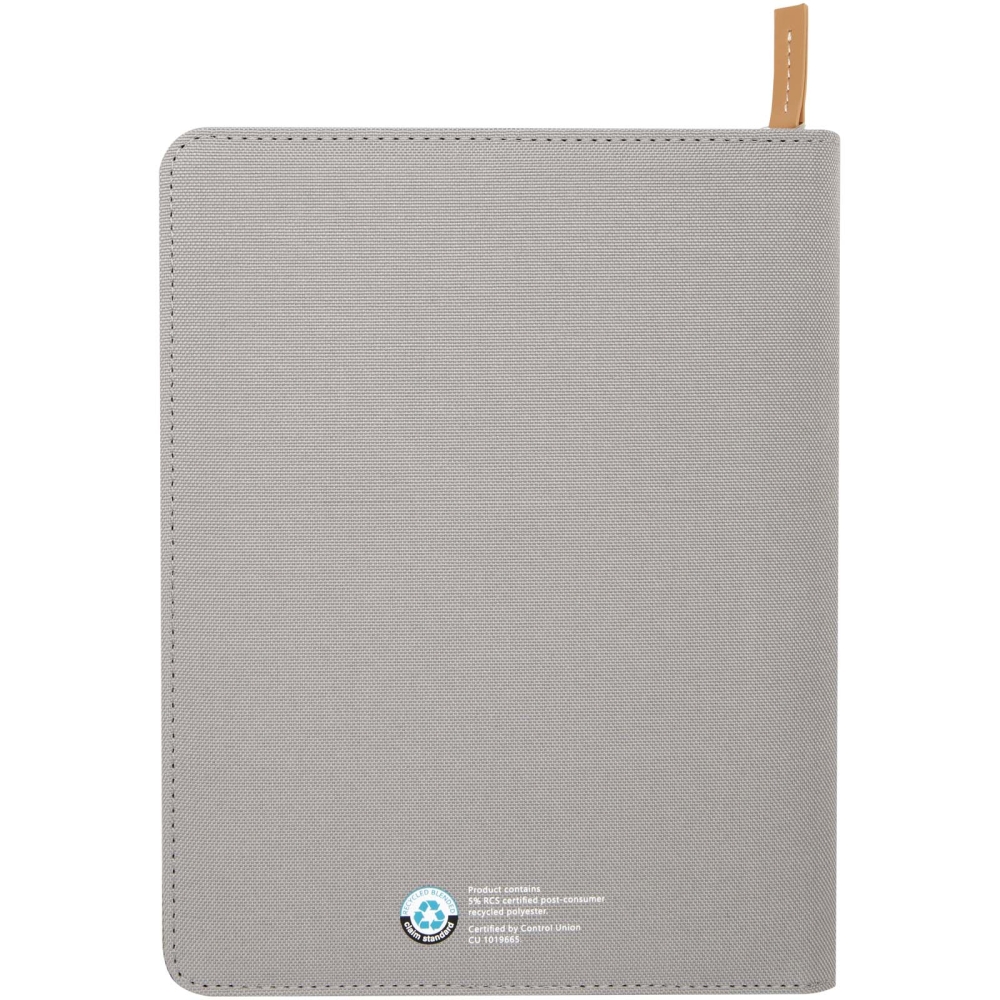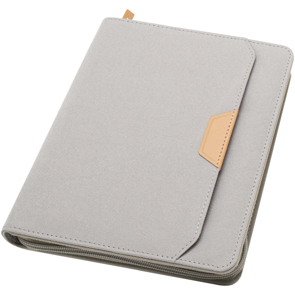 Portfolio A5 se zaoblenými rohy je praktickou pomůckou do každé kanceláře a je vyrobené z recyklovaného plastu. Disponuje 64 linkovanými listy papíru v krémové barvě o gramáži 80 g/m2, zapínáním na zip, poutkem na pero a rozšiřitelnou kapsou. Rozměry: 22,5 x 18 cm