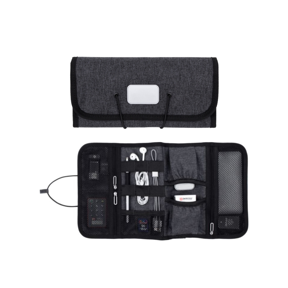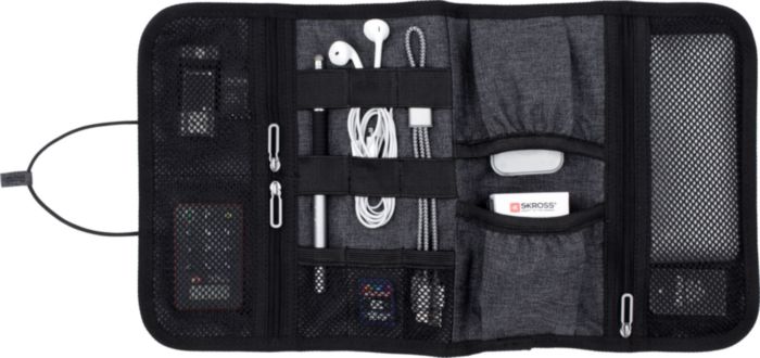 Skládací organizér BrandCharger na kabely a počítačové doplňky. Vyrobeno z prvotřídního polyesteru 600D odpuzujícího vodu a skvrny, jeho kompaktní design umožňuje snadné zastrčení do kabelky, batohu nebo kufru. Praktické uspořádání zahrnuje 6 elastických smyček na kabely a nářadí, 3 síťované kapsy na malé předměty, jako jsou USB nebo SD karty, a 2 otevřené kapsy na nabíječky nebo napájecí adaptéry. Rozměry: 24,5 × 14,5 × 2 cm.