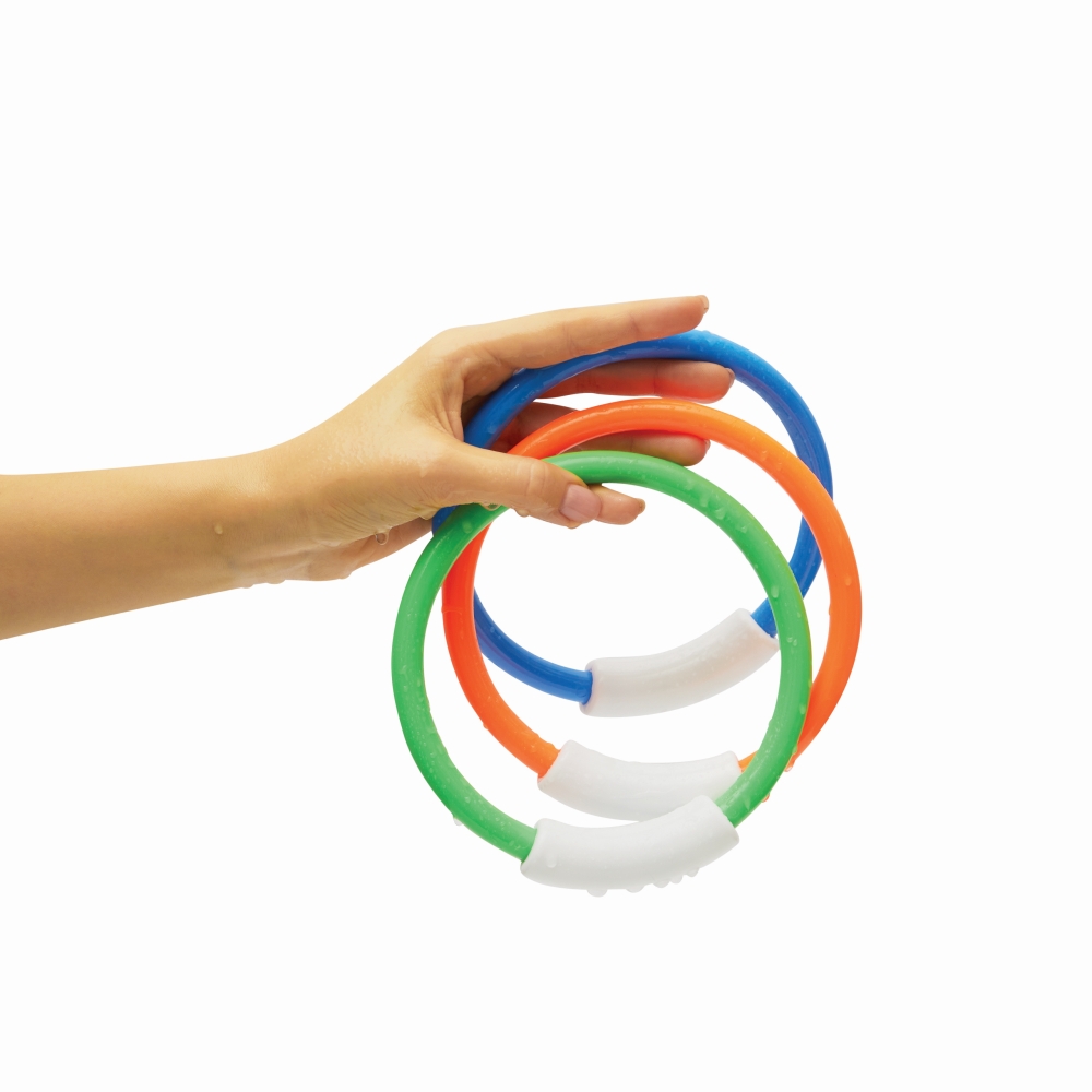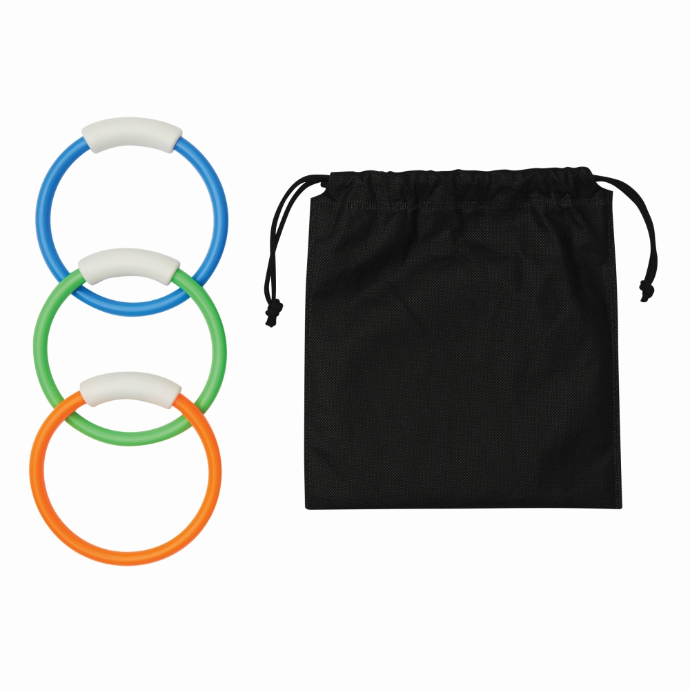 Sada 3 barevných potapěčských kroužků (oranžová, modrá, zelená). Bílá část kroužku se plní vodou, což způsobuje, že kroužek stojí vzpřímeně na dně bazénu a snadno se uchopuje. Dodáváno v černém stahovacím pytíku. Rozměry: O 14 cm.