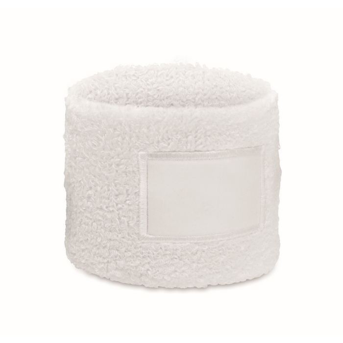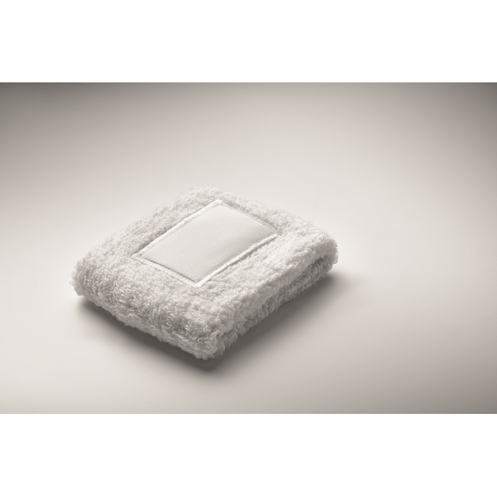 Potítko na zápěstí z polybavlny (79% bavlna, 13 % elastan, 8 % polyester) s bavlněnou nášivkou pro potisk.Rozměry: 8 x 6cm